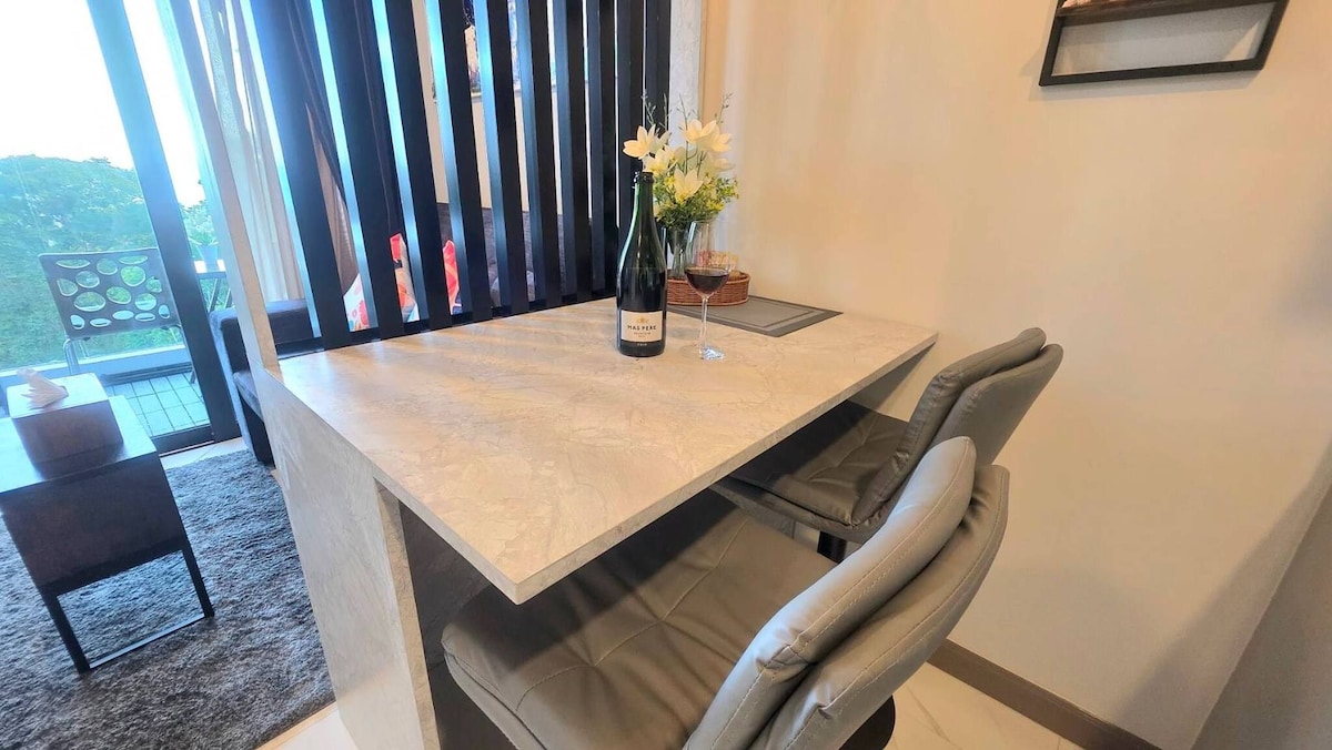 Our accommodation is a 52 square meter apartment. The common area has a beautiful saltwater swimming pool. There is 1 large bedroom with 1 king size bed, a living room for watching TV with a sofa and kitchenware with a 4-burner electric stove for heating and a room with a sunset view on the balcony. The living area has a smart TV and 2 air conditioners. There is free WiFi. Suitable for a family of 2-3 people and there is a private bathroom with a water heater