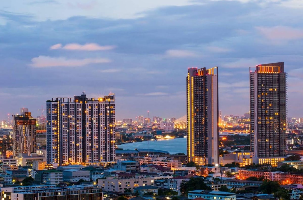 Cozy & sunrise 🌅 view condominium next to Chao Phraya River on 47th floor with a view of Bangkok skyline from the patio .. There are lot of sunlight comes in the room through out the day with lot of energy and good vibes 🤍 Facilities upto 3 huge swimming pools with the signature infinity sky pool on with stunning river and sunset view, there is a clubhouse with games room, Co-working space infront of river as well as with 360 degree view of Bangkok :)
