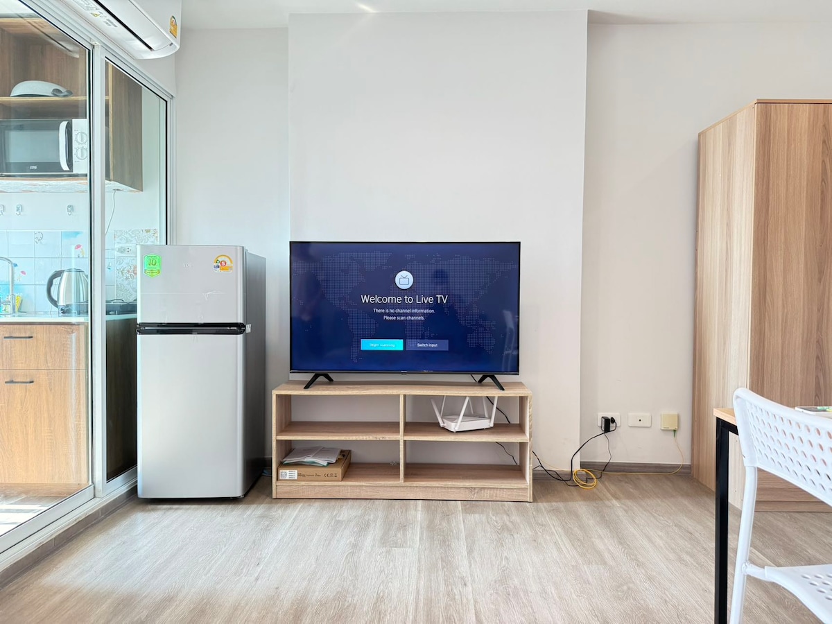 Condo on the main road (with kitchen, 1 BR, 2 aircon ,gym, swimming pool, smartTV & WiFi). Located in Nonthaburi only 3 mins walking to MRT purple line Tiwanon Station (use exit 4 walk my place just 1 minute) very convenient for you to travel in Bangkok and near Shopping Mall (10 mins walk), Don Muang Airport (DMK Airport), ig C Super Store (15 mins walk). Very fast and easy to go into the middle of City