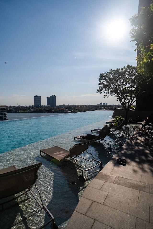 A Spectacular Cozy condominium next to Chao Phraya River a very high floor with a view of Bangkok skyline from bed and patio .. There are lot of sunlight comes in the room through out the day with lot of energy and good vibes 🤍 Facilities upto 3 huge swimming pools with the signature infinity sky pool on 56th floor with stunning river and sunset view, there is a clubhouse with games room, Co-working space infront of river as well with 360 degree view of Bangkok :)