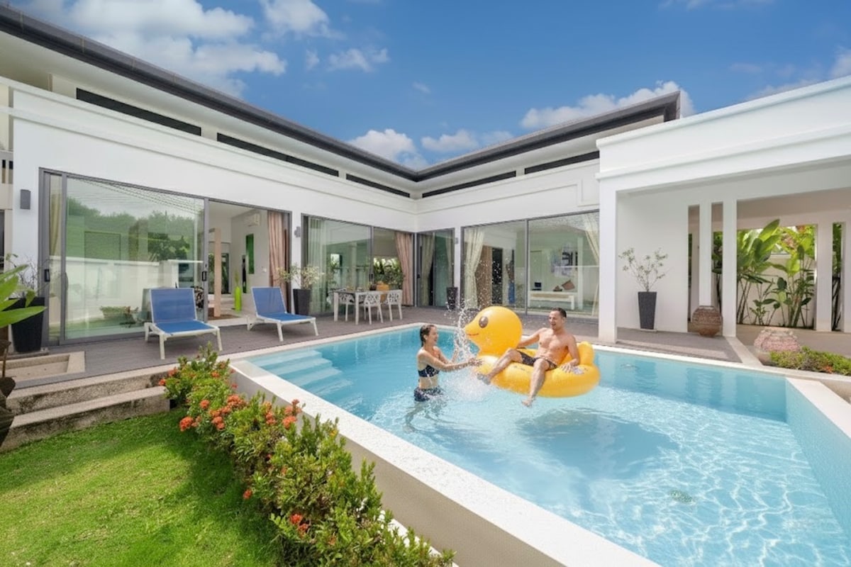 Private Pool Villa, 2 bedrooms and 2 bathrooms with Jacuzzi bathtub. (Pool not share with others) Local grocery next to villa. Convenient store 7 Eleven and Family Mart at the entrance from the main road. 6 minutes from Tesco Lotus and Villa Market. Located near Big Buddha and activities nearby Elephant camp, ATV adventure, Bird Park, Chalong Temple and 10 minutes from Chalong pier for island hopping tour. Size : 200 sq.m. (Entire Villa) Monthly price available just select 28 days or more.