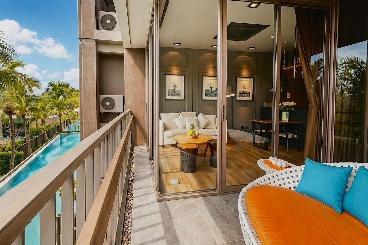 Modern 2-bedroom apartment with direct pool access in The Title Resort, just steps from Rawai Beach. The total area is 63 sqm, including an 8 sqm private terrace. It features a fully equipped kitchen, a cozy living area, and access to resort facilities such as swimming pools, gardens, lobby and 24-hour security—perfect for families or couples seeking comfort and relaxation in Phuket.