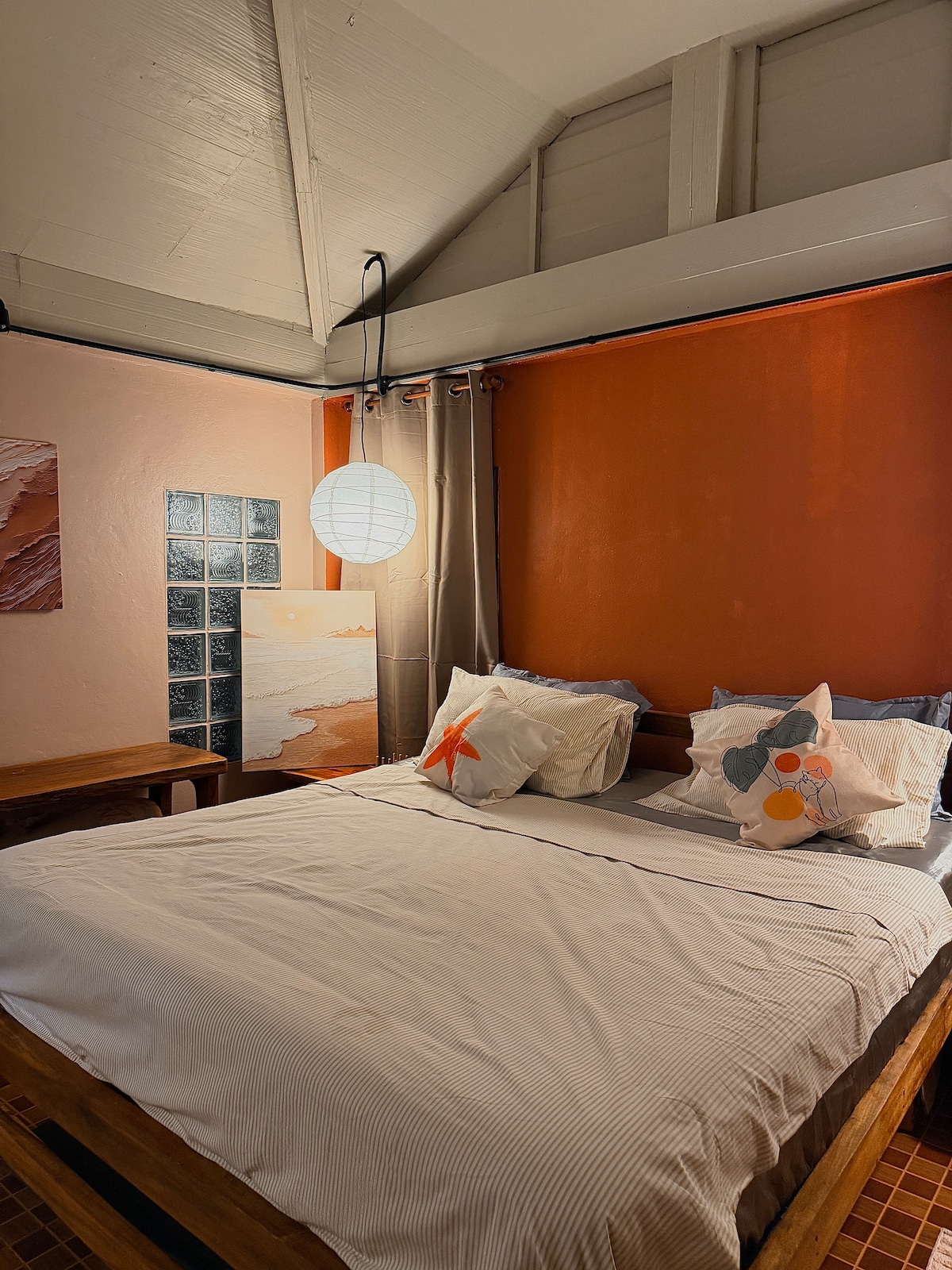Kick back and relax in this calm, stylish space.A cute terracotta-toned room with warm wood details and soft beach-themed décor. Just a 1-minute walk to the sea, with a small ocean view from the room. Perfect for guests seeking a cosy, relaxed stay close to nature and the beach breeze.
