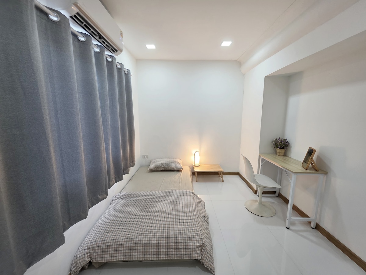 Enjoy a cozy, 24 sqm studio just 5 minutes from Bearing BTS. This modern apartment features natural light, blackout curtains, and a private kitchenette with essential amenities. Located in peaceful Bangna, it’s surrounded by local markets and food stalls. Shared building facilities include a gym, laundromat, and living area. With 24/7 security, it’s perfect for a secure and stress-free stay. Just 40 minutes from Bangkok’s city center by BTS.
