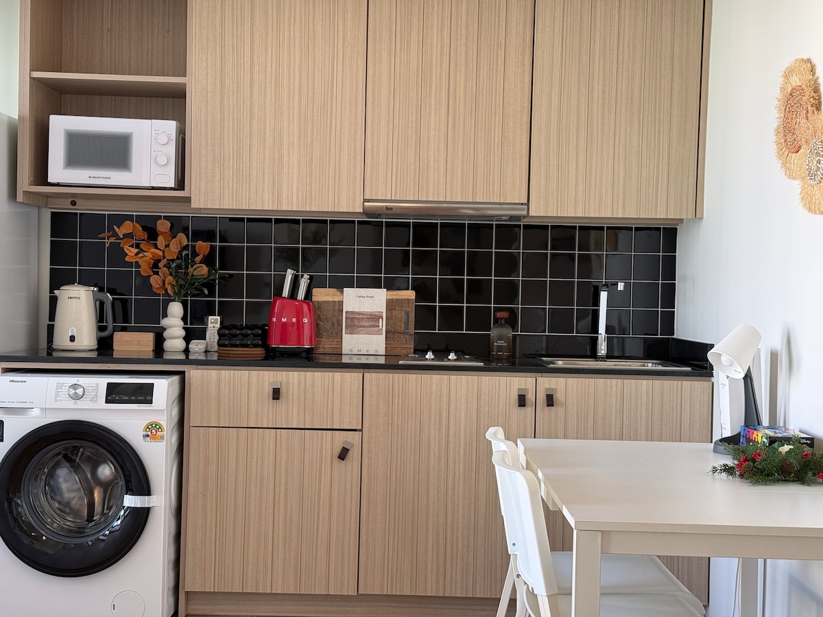 Brand new modern condo at Sukhumvit road close to BTS skytrain. - 6 mins walk to BTS Skytrain Bearing station - Fully furnished room. - Great facilities ( Swimming pool, Fitness, co-working space, Garden) - 1 min walk to Convenience store ( 7-Eleven, Tesco) - 1 min walk to local market, Street foods are a few steps. - Local residential area, quiet peaceful but still convenience to access to skytrain - Sunset view at Balcony with nature light in the morning.