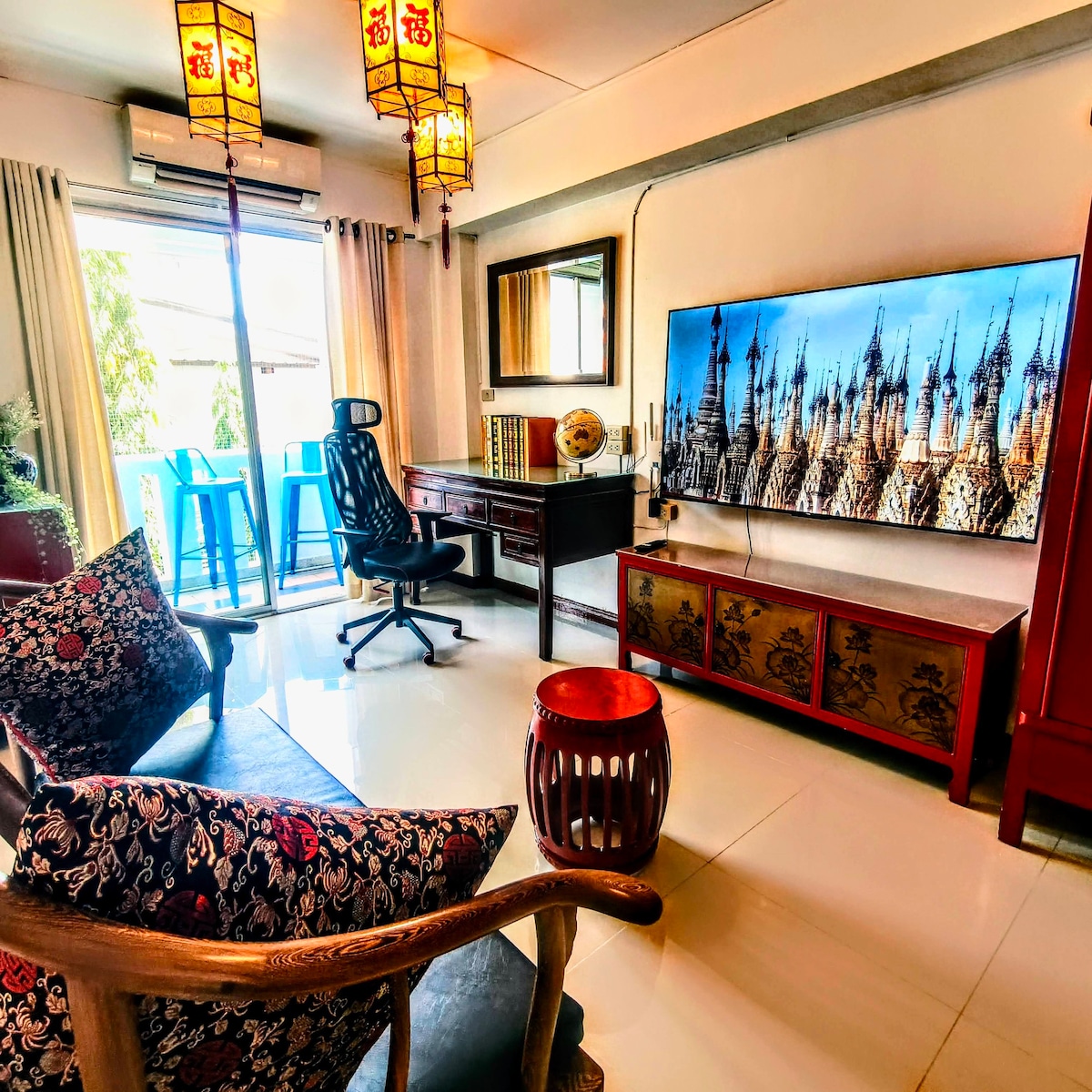 Welcome to The Forest Duplex Retreat – a relaxing nature escape in a quiet green setting. 🍀 The duplex features a bright, high-ceiling living area that feels open and airy. Large glass windows invite natural light and greenery into the space, creating a seamless connection between indoor comfort and outdoor serenity. Imagine wake up to birdsong and soft light filtering through the trees, relax on the soft sofa, work by the window with forest views, or simply enjoy stream your favorite shows.