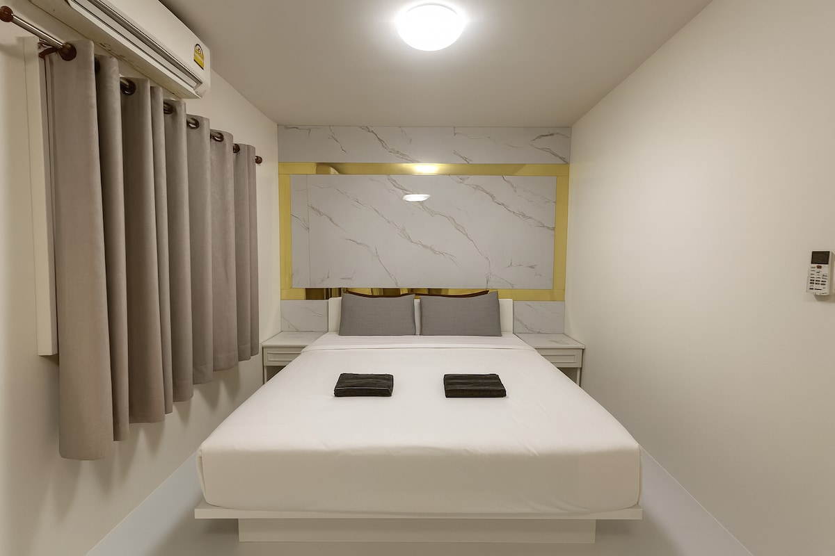 The private room designed in a warm and cozy Minimal style inspired by Paknam city. The room features a mini kitchen with a microwave. A balcony with a sink offers a view of the city and monorail, while the living and dining area boasts a 3-meter long glass balcony that bathes the room in natural light. Guests can work, dine, and relax in a comfortable corner of the room, and high-speed Wi-Fi is available throughout.