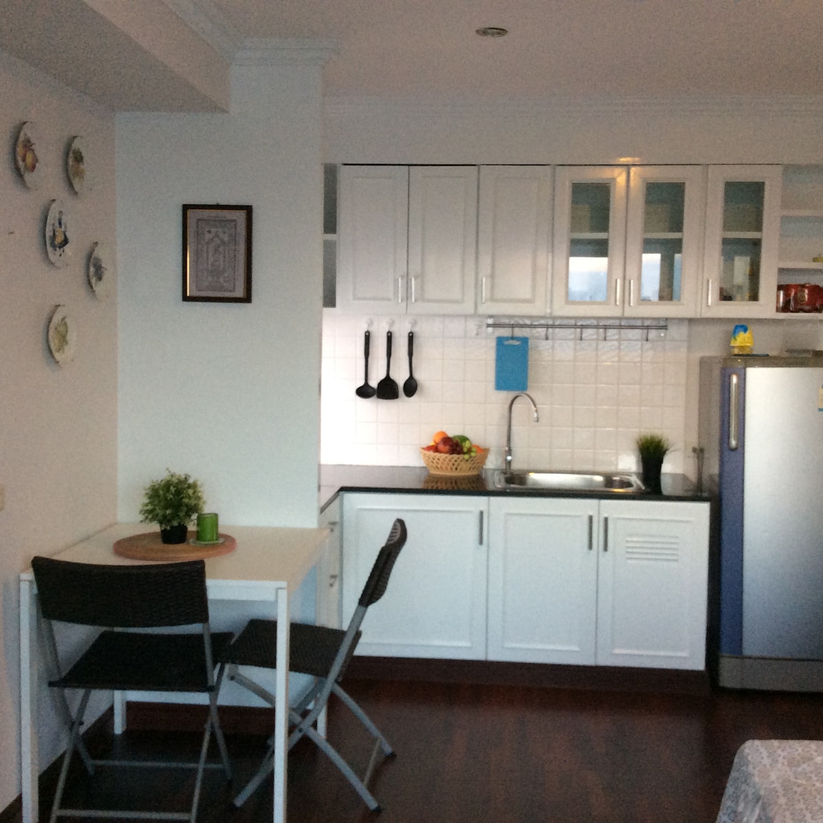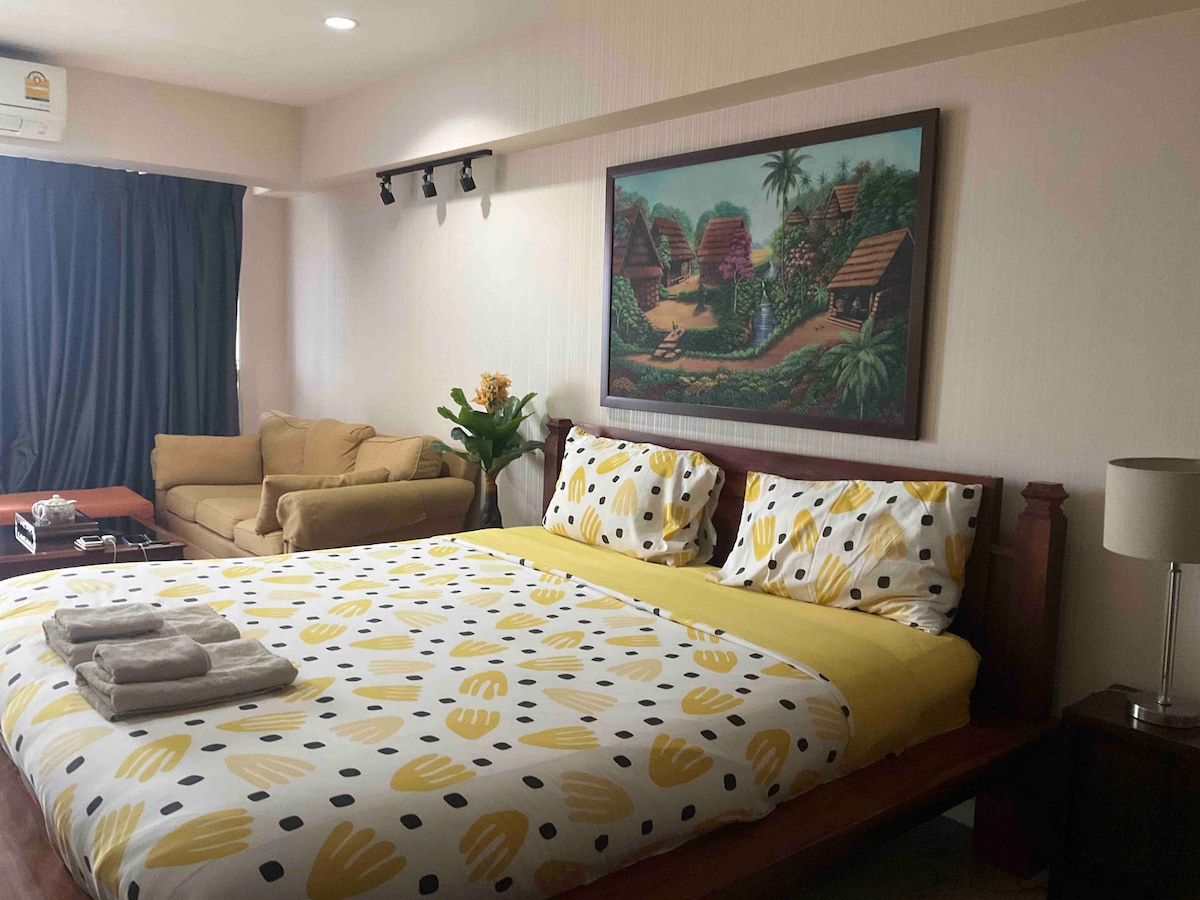 34.5 square-meter apartment located on 5th floor of a low-rise building with 1 bedroom and a king-size bed, 1 bathroom with hot shower, living room with sofa and a big screen TV, a sink and small kitchen area (hot plate stove provided). There is also a small balcony next to the kitchen area. The apartment offers a swimming pool and a fitness room you can enjoy :)