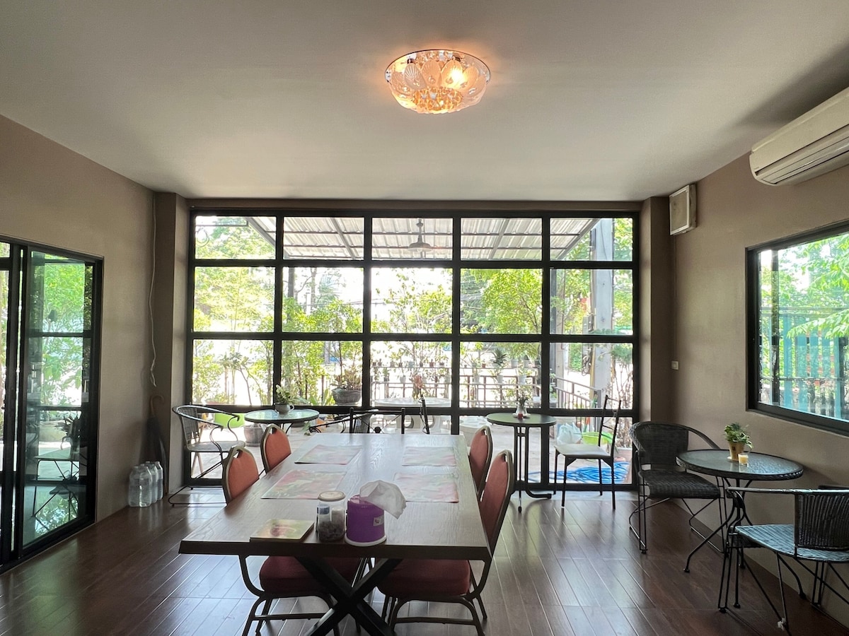 A peaceful house located in Udonthani with 3 bedrooms, 2 bathrooms, 1 dining room. Equiped with neccessary facilities; free wifi, washing machine, refrigerator, kettle, microwave, dishes and silverwares, and bicycle. All are free of charge. You can spend your days by reading, napping, or doing your work. It's very peaceful and private. Only 5-10 mins by walk to 7-eleven and many local food shops. Online food delivery is available in this area. Let's enjoy your days with us.