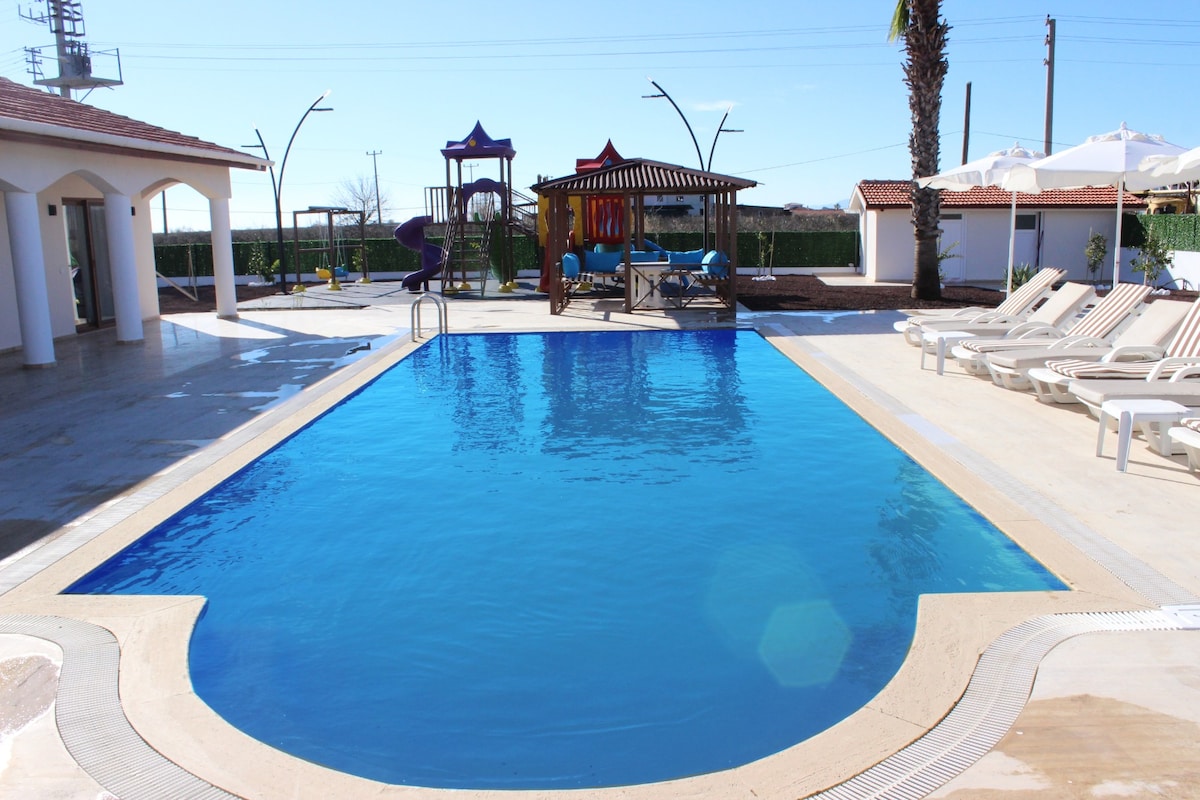 Brand new villa with 4 bedrooms and private pool for 10 people, 10 minutes walking distance from Dalyan center. It is in a beautiful location, in an open and spacious area. The villa was built in June 2022 and all furniture, appliances and kitchen supplies are new. It has a large garden and a large pool. It is an ideal villa for large groups and friends.(Electricity and water fees for long-term stays belong to the guest)