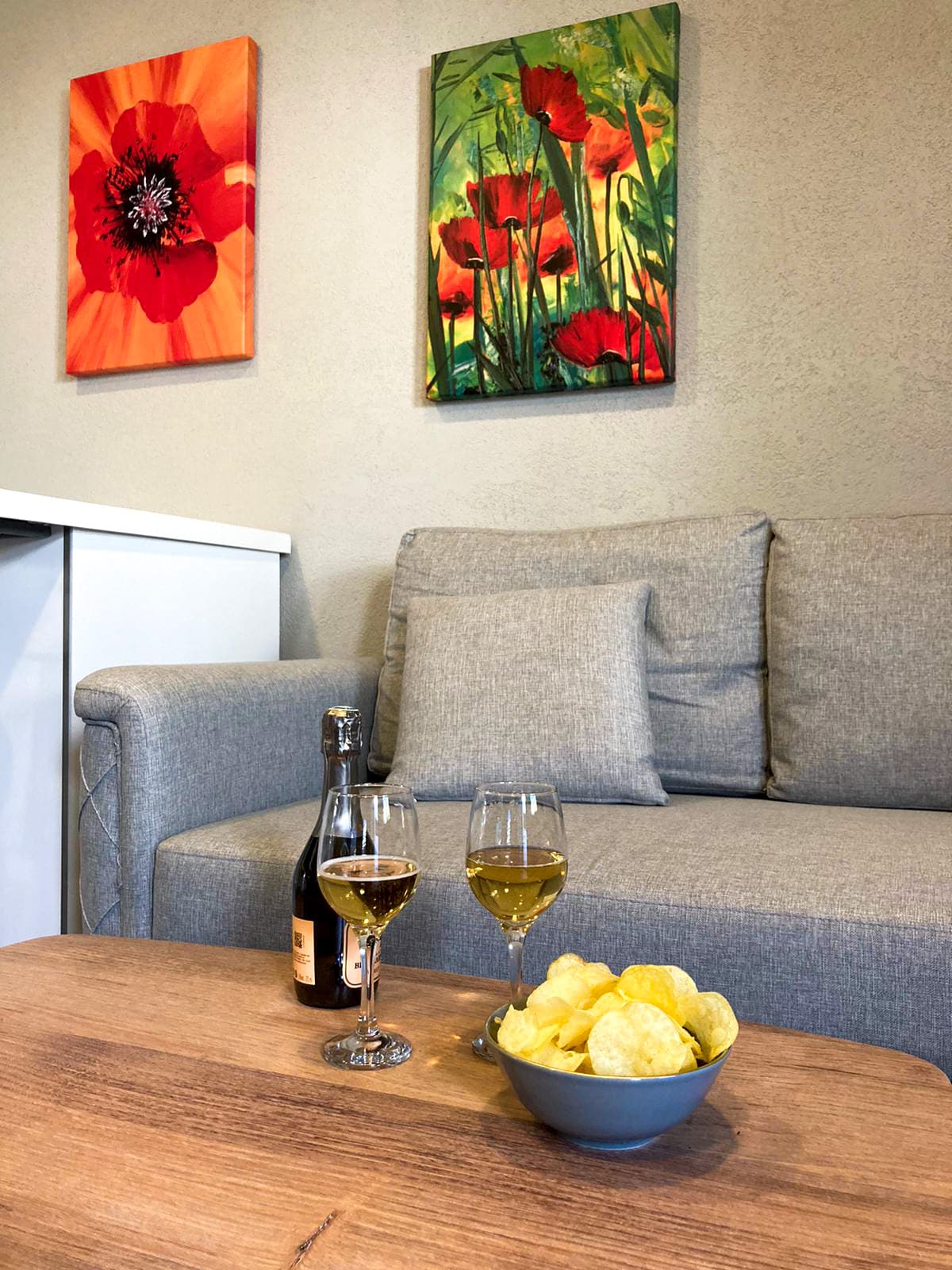 There is also a fully equipped small kitchen where you can cook in our suite apartments, which can comfortably accommodate 4 people. There is 1 double bed in the bedroom and another double bed that opens from the wall in the living room. It is quite centrally located. It is within walking distance to cafes, restaurants, beaches and shopping centers.