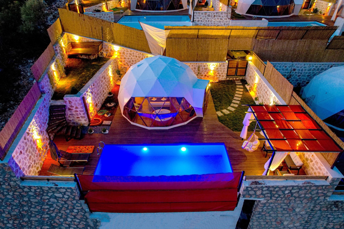 Türkiye'de yeni yeni popülerleşmeye başlayan dome glamping tasarımlı evlerimiz, muhteşem konsepti ile dikkat çekmektedir. Kalkan Çayköy bölgesinde konumlandırılmış olan dome balayı suitimiz, sizler için özel olarak tasarlanmıştır. Modern ve oldukça farklı bir dizayna sahip olan balayı suitimiz korunaklı yapısı ile de dikkat çekmektedir. Alışılmışın dışında bir tatil deneyimi yaşamak istiyorsanız, Kalkan Dome Suites 8 kapılarını siz değerli misafirlerimiz için aralamaktadır.