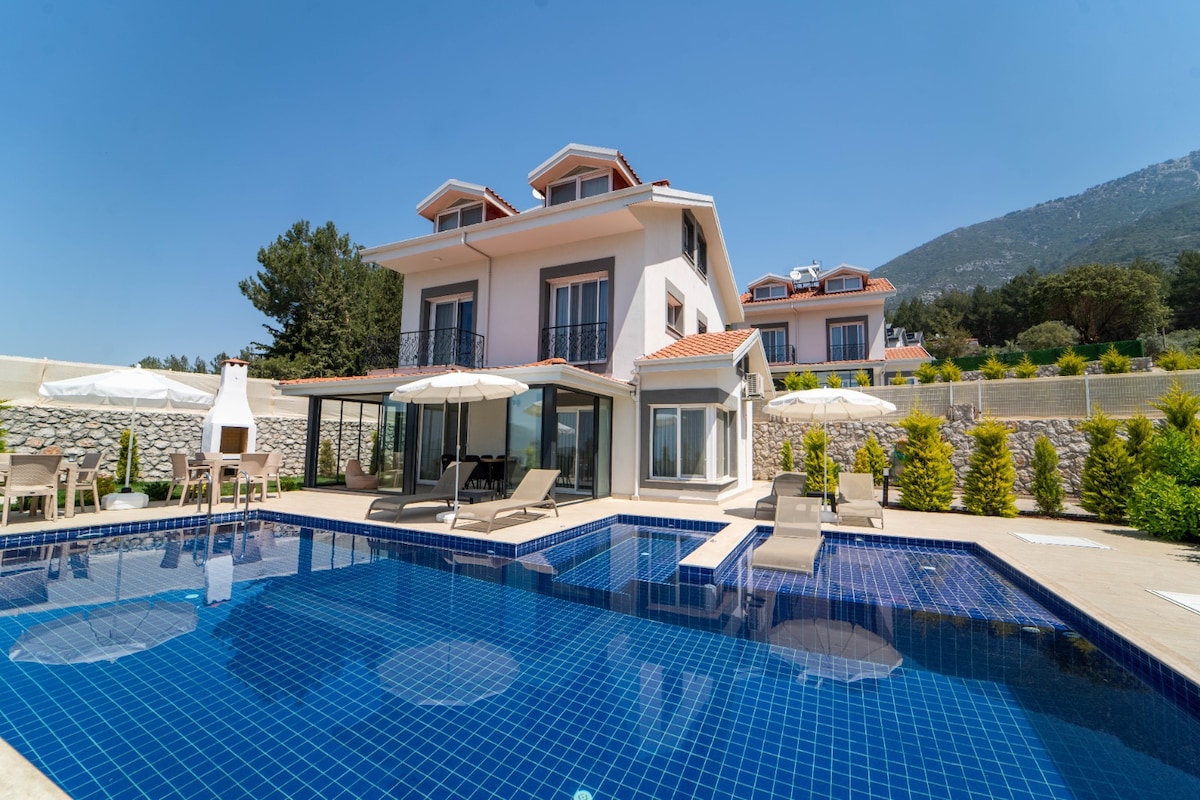 Bu ev, muhteşem dağ manzaraları ve doğasıyla sizi büyüleyecek olan Fethiye Ölüdenizdedir.Dünyaca ünlü Ölüdeniz plajına 4 km mesafededir ve Hisaronu eglence alanina yuruyerek 10 dkdir.Ev 3 yatak odali ve herbirinin kendi banyosu vardir. Çati katinda jakuzi ve spor salonu mevcuttur.Genis bahçemizde 8 m boylarinda 1 havuzumuz vardir.Ayrıca bir mangal ve cocuklar icin trambolin bulunmaktadır.Evde sınırsız internet erişimi vardir.Havuz haziran itibariyle aktif olacaktir.