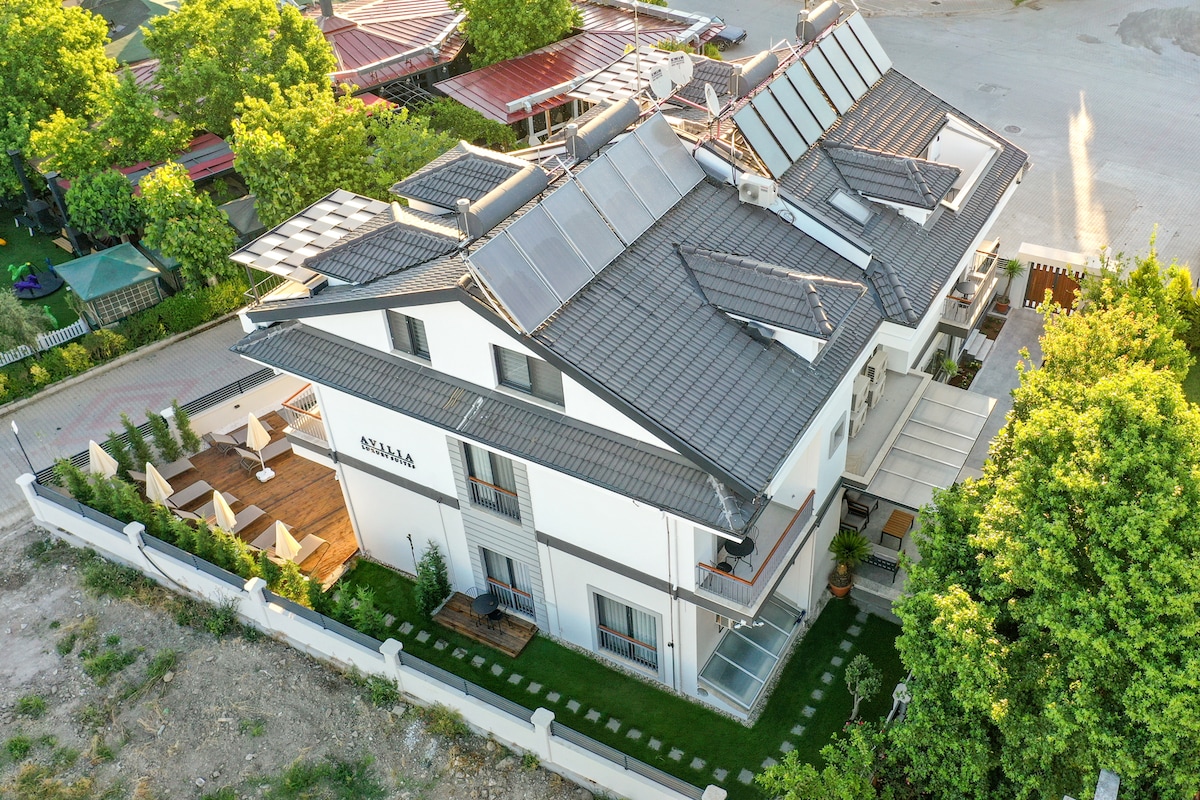 Situated in one of the Fethiye’s most beautiful neighbourhoods, "Avilia Suites" enjoys a prestigious and convenient location. It is right next to the famous promenade filled with restaurants, friendly bars, pubs, jogging and bicycle path. This 60 m2 suite has 2 bedrooms, a living room, a balcony with a hot tub and 2 bathrooms. 2nd living room(has no door) has a sofa bed and its own bathroom. This suite does not have cooking equipments to cook meals and it is not possible to cook in this suite.