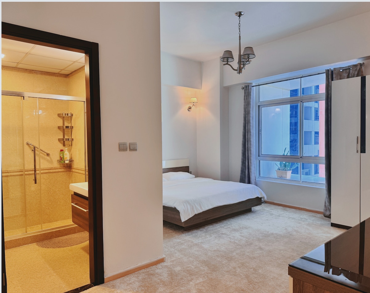 Find your inner peace and enjoy the most stunning view in this newly built apartment in Era View, Manama. This exquisite apartment #343 situated on the 34th floor, features a balcony(city/sea view), a cozy living room, bedroom with feather beddings, a fully equipped kitchen, dining area, toilet with free toiletries, two Smart 55-inches TVs (Netflix/Amazon Prime available), and high-speed internet access ideal for work and personal use.