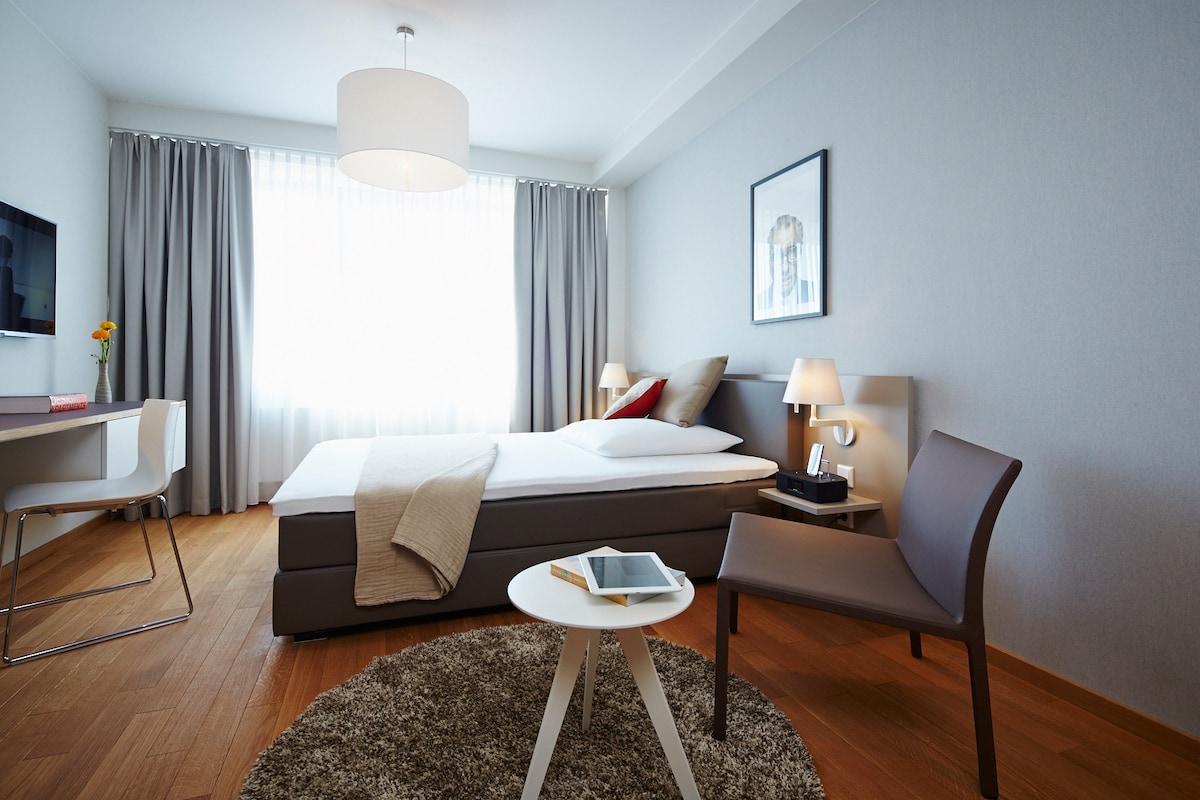 Small but impressive: the Xtra Smart ipartment offers the most important functions for a comfortable stay. Ideal for those who are traveling alone and appreciate an unbeatable price-performance ratio. Custom-made installations, designer kitchen and the 140cm bed are skilfully integrated. Work area and a lounge armchair complete this compact unit. We are looking forward to your stay with us and wish you already in advance a most pleasant time in our Xtra Smart ipartment.