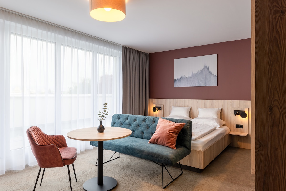 Geräumiges und barrierefreies Apartment (35 m²) mit Platz für bis zu 4 Personen (mit Zustellbetten). Das Studio ist ideal in Schlaf-, Wohn- und Arbeitsbereiche aufgeteilt und mit Badezimmer, Kitchenette und großzügigem Balkon/Terrasse ausgestattet. Unterhaltung wie zuhause durch Smart-TV, Soundbar und zimmereigenem WLAN.