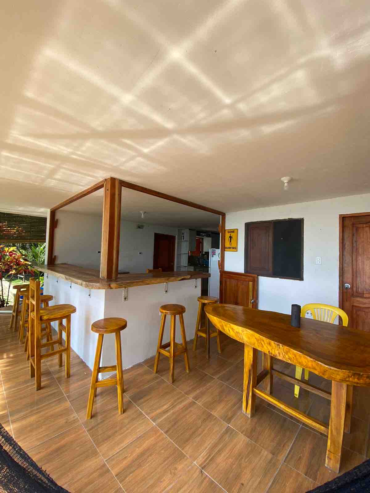 5 Double Bedrooms for up to 11 people located on the top floors of a classic Bamboo House located in front of the Beach. Private entrance, private & shared bathrooms, kitchen with refrigerator, spacious common room with hammocks and panoramic view over Mompiche bay, free Wifi throughout the place.