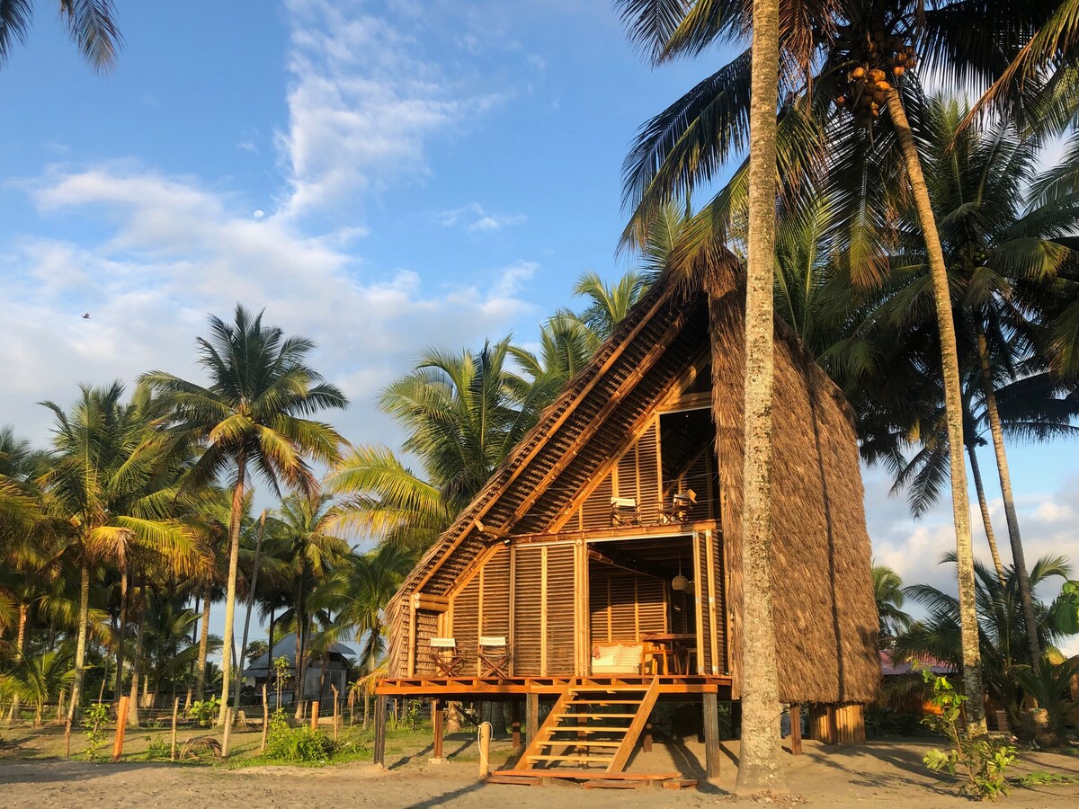 In our cabin in the palm grove by the sea you will feel the cozy aesthetics of bamboo, wood and toquilla. The carefully designed architecture is in direct contact with nature. Enjoy the transparent sea and the clear sand of the wide beach lined with palm trees. The Island is a natural sanctuary where turtles nest and whales arrive. Disconnect from the routine in the tranquility of the island, paddle through the mangroves, fish or make boat trips to the nearby islands or go whale watching.