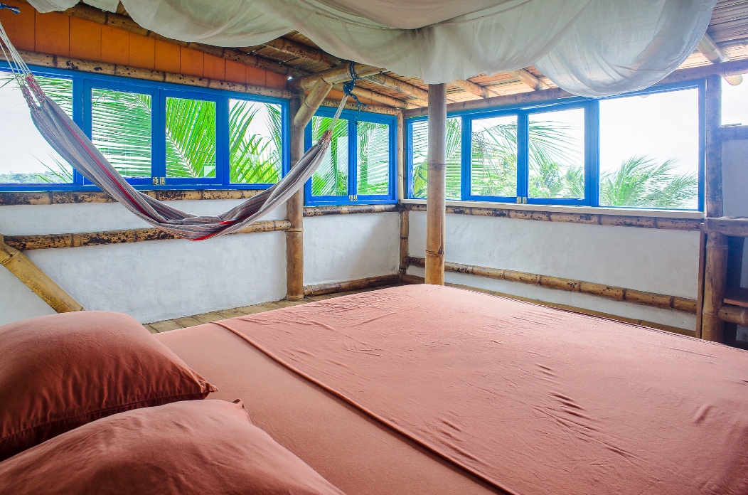 5 Double Bedrooms for up to 11 people located on the top floors of a classic Bamboo House located in front of the Beach. Private entrance, private & shared bathrooms, kitchen with refrigerator, spacious common room with hammocks and panoramic view over Mompiche bay, free Wifi throughout the place.