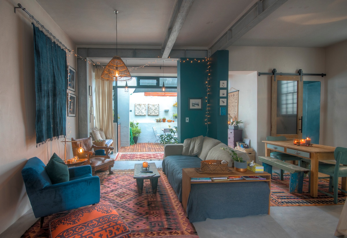 A beautiful one-bedroom apartment in the picturesque town of Kalk Bay. An amazing space if you are on holiday or a business trip. Situated 25m from the main road and walking distance from many delicious restaurants. This apartment has its own fully functioning kitchen with everything you will need to cook up a storm or you could order food and sit by the fire for an evening in. It also has its own private courtyard with shutter doors that can be opened all the way to invite the outside in.