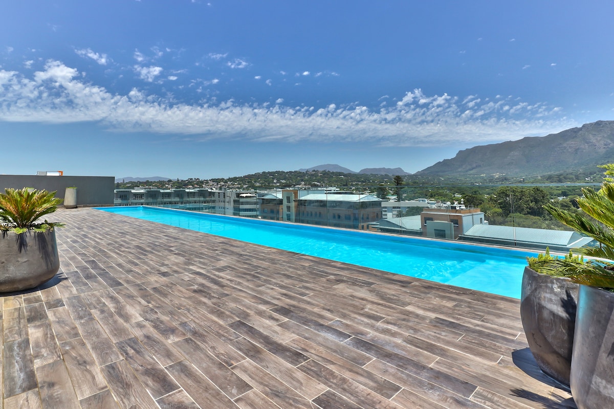 Fully furnished studio apartment with a leafy mountain view in the highly sought-out Newlands Peak luxury apartment building. With a rooftop deck, swimming pool, indoor and outdoor gyms, barbecue facilities, laundromat, coffee shop, and 24-hour security: there’s really no reason to leave! Centrally located - close to University of Cape Town, Newlands Forest, Kirstenbosch Botanical Gardens, Newlands Cricket Ground, Cavendish Square Mall, and only a 20-minute drive from Table Mountain.