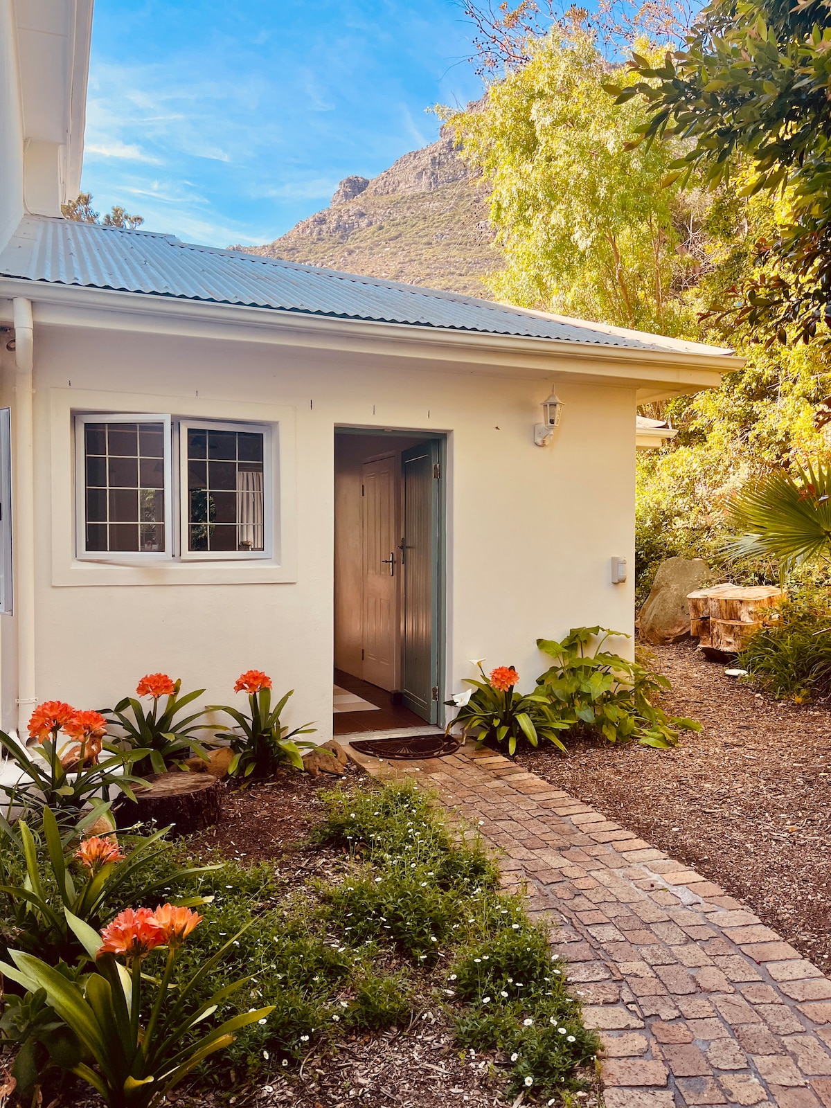 Our cozy cottage is a peaceful haven with separate entrance. It is surrounded by trees. The ocean lulls you to sleep at night. It's a 5 to 10 minute walk to the beach, train station, music cafe's and food markets in our creative village community. This is an ideal retreat if you are looking for a place to work (we have fibre internet and a back up system for keeping it on during loadshedding) or just be still and rest, away from the crowds, but within easy walking distance from company.