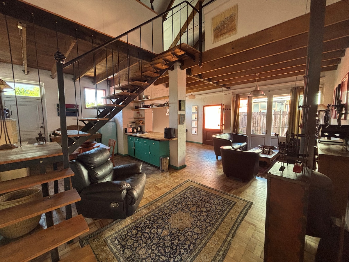 This spacious and eclectic studio apartment is perfect for working artists or digital nomads. An airy open plan living space downstairs and upstairs a large private sleeping and working floor with excellent south light and beautiful views of the mountain. A small secluded al fresco dining area and a shared tranquil garden, close to all amenities in Muizenberg with the beach just a short walk away and the bohemian buzz of the village and Mother Nature surrounds to inspire artists & troubadours.
