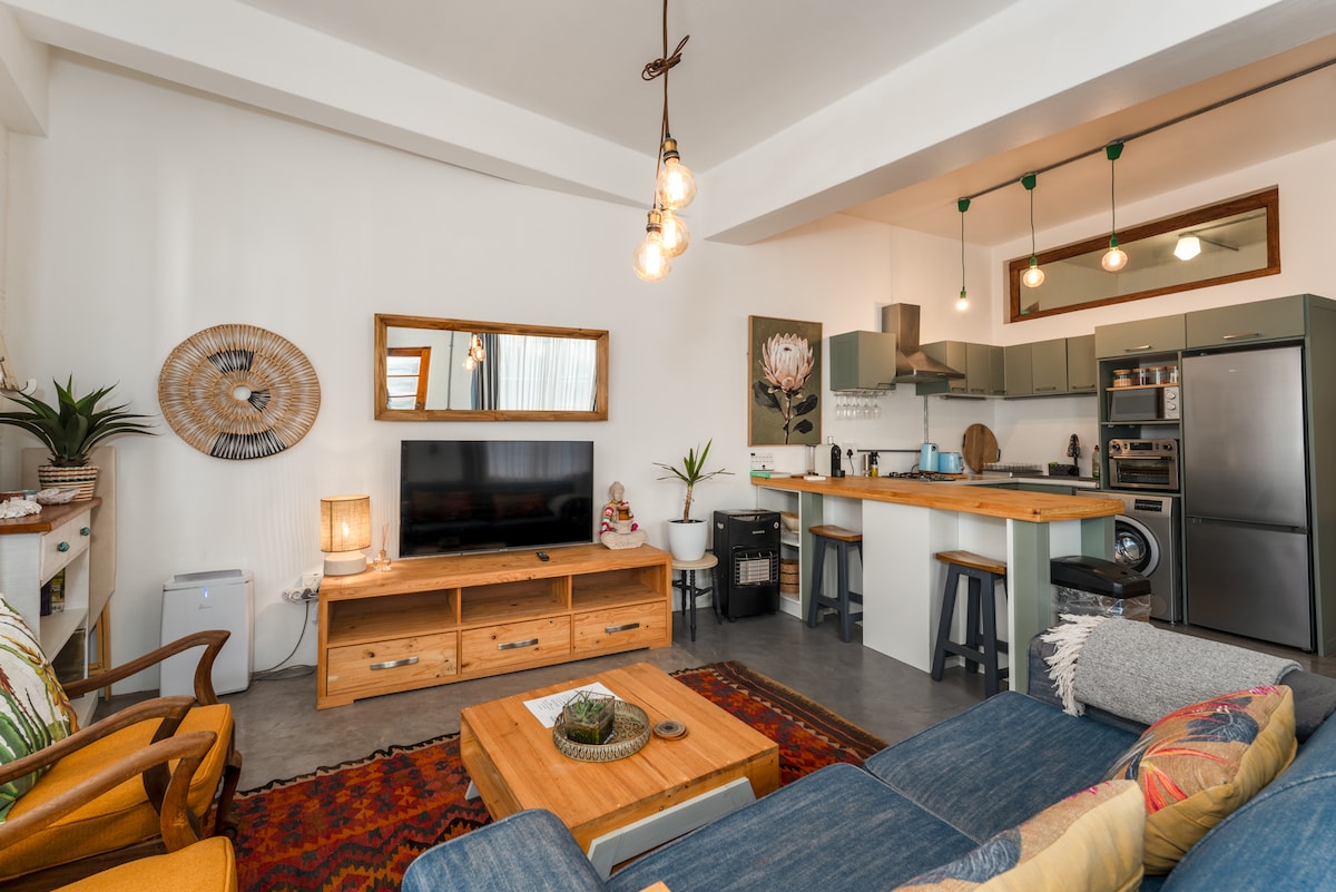 A beautiful one-bedroom apartment in the picturesque town of Kalk Bay. An amazing space if you are on holiday or a business trip. Situated 25m from the main road and walking distance from many delicious restaurants. This apartment has its own fully functioning kitchen with everything you will need to cook up a storm or you could order food and sit by the fire for an evening in. It also has its own private courtyard with shutter doors that can be opened all the way to invite the outside in.