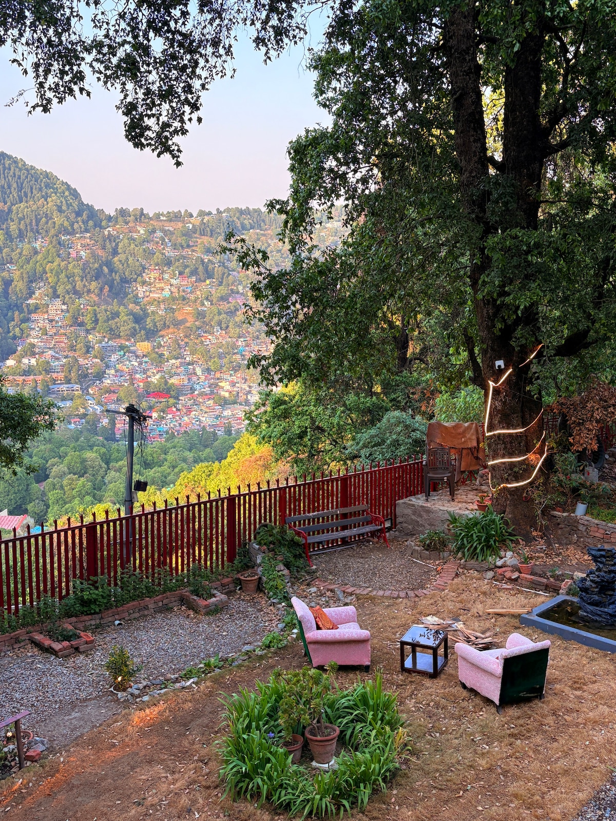 Wake up to serene valley views at this peaceful 1-room retreat in Mukteshwar, near Hanuman Mandir. A cosy bedroom opens onto a private balcony where you can sip morning tea or watch sunset skies. Explore beautifully landscaped common spaces, from a spacious terrace to a stepped garden surrounded by nature. Nearby, visit scenic Sunset Point or wander through the charming IVRI campus. Perfect for travellers seeking calm, comfort, and unforgettable mountain views
