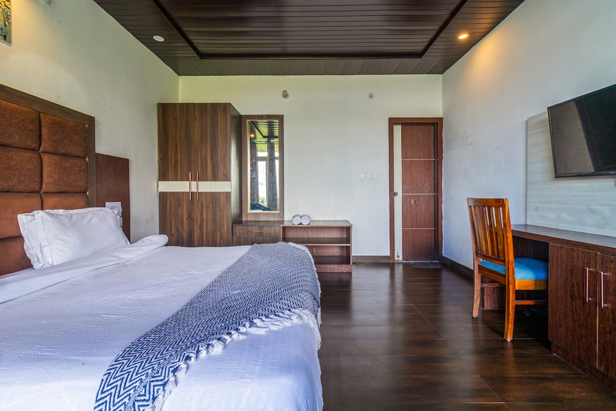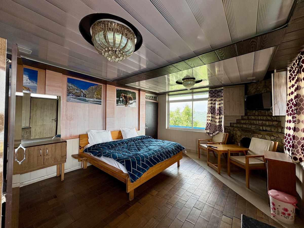 Cozy Room with Dining Area, Restaurant & Pool Access . Unwind in this serene and comfortable private room nestled in the hills of Bhimtal. Perfect for couples, solo travelers, or small families, the room offers a peaceful retreat surrounded by nature. Enjoy access to a beautiful shared dining area, an on-site restaurant serving local and multi-cuisine meals, and a sparkling pool to relax and soak in the sun.