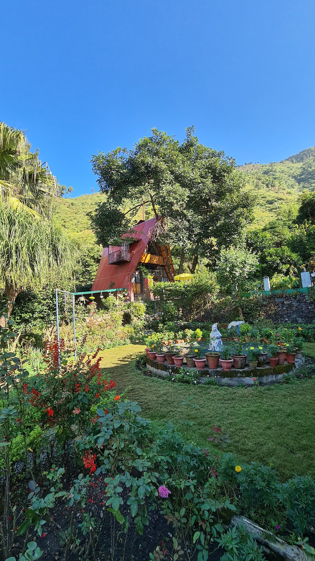 For 2 adults and two kids. A two- storeyed, A shaped Glass- Wood- And- Stone studio villa amidst an Avocado canopy and a small Kiwi vineyard and quite a few rare flower plants in the premise of our ancestral property. Vinatge setting, a fireplace, a freshwater spring, many ponds, a hammock and the constant chirp of birds to keep you company. Ideal for trekkers, readers, bird wacthers, nature lovers, meditation practitioners or people just looking for a quiet spot in a forest.