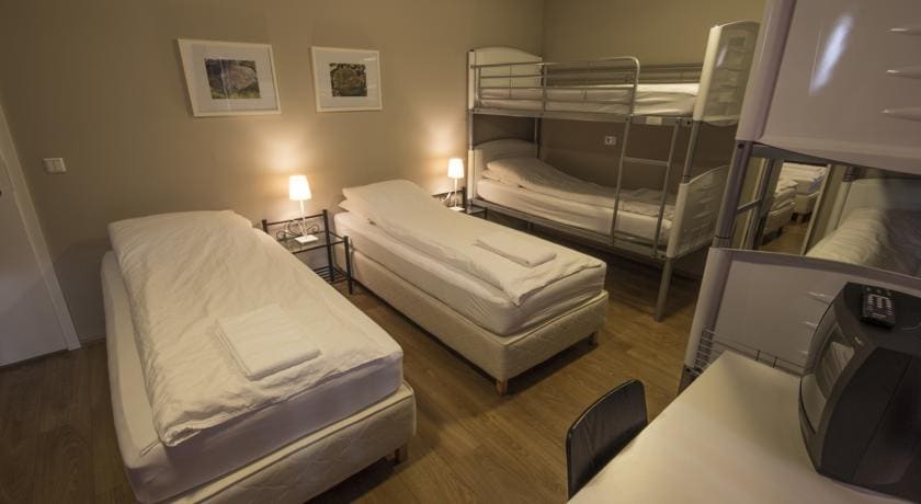 Double / Twin room has beds up to 6 pers double or single bed + 2 bunk beds Tehúsið Hostel has 6 rooms. 2 shared rooms w/bunk beads women, mixed and 4 rooms private for 6-8pers each. In Tehusid Hostel is also a Café/ Bar where u can buy Breakfast or light meals.