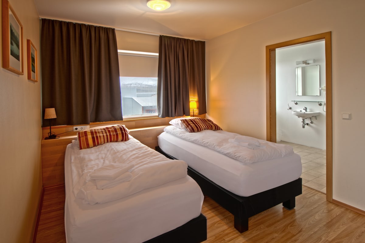 Hotel Framtid Standard Room In our main building, we have twenty 17 m2 rooms with showers, facilities, hairdryer, phone, a TV and a coff ee- and tea set. The rooms all have two beds but with a possibility to add an extra bed and as such are suited for 2-3 persons. Standard Room Í aðalálmunni okkar eru tuttugu 17m2 herbergi með sturtu, hreinlætisaðstöðu, hárþurrku, síma, sjónvarpi, kaffi - og tesetti. Herbergin eru öll með tveimur rúmum en hægt er að setja inn auka rúm og henta því fyrir 2 – 3 persónur.