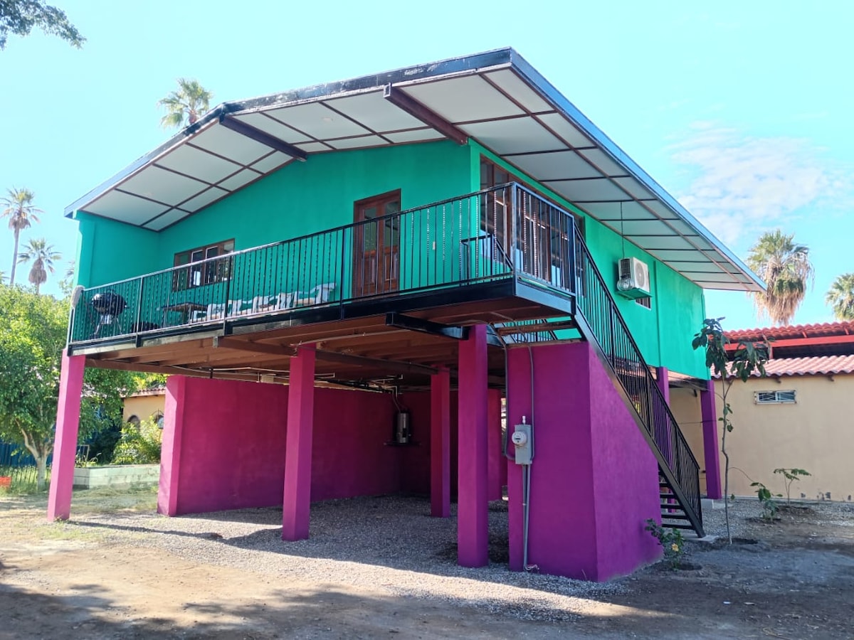 Casita Azul is a 2 bedroom casita close to town in a private palm grove oasis providing a safe, peaceful, and unique stay. Enjoy Starlink internet, a high quality king sized bed, two twin beds, smart TV, full kitchen, dining & living room areas, abundant parking, outdoor seating and more. An easy 15 min walk or 5 min drive into town, 15-20 minute drive to beautiful white sand beaches. The property is totally fenced so your dogs can have some off-leash play time too!