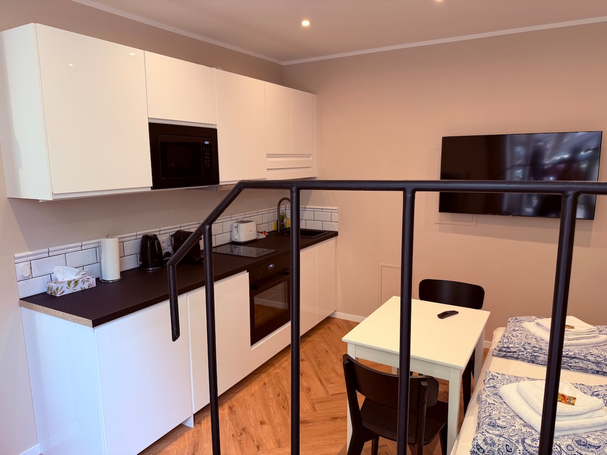 Apartment 1 ist 30m2 groß und wurde im Sommer 2016 komplett renoviert. Eine Küchenzeile ist mit Spülmaschine, Kochplatten, Mikrowelle, sowie einer Senseo Kaffeemaschine komplett eingerichtet. Es gibt keine Waschmöglichkeiten in dieser Wohnung. Der lichtdurchflutete Wohnraum ist modern und liebevoll eingerichtet. Ein gemütliches Sofa lädt zum Entspannen ein und im Doppelbett (Breite 140cm) lässt sich gut schlafen. Freies Wlan. Gute Lage (15 Minuten bis zum Bahnhof Köln Messe/Deutz).