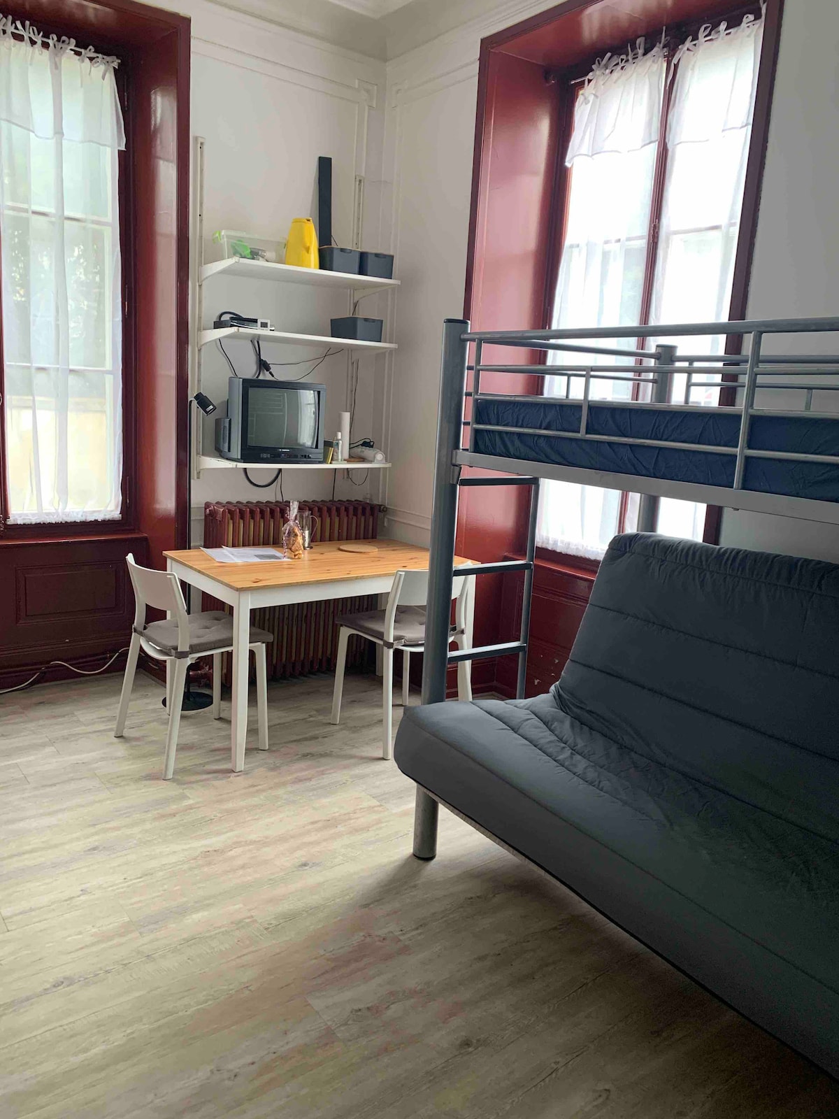 Petit studio d'environ 18m2, situé face au parc Jacquet. Il est équipé d'un lit mezzanine (1 place) avec un canapé-lit juste en dessous (2 places), d’une salle de bain avec WC et d'une petite cuisine ( vaisselle, plaque de cuisson, four micro-onde, frigo….). Il dispose d'une petite dépendance avec un lave linge. Il y a une télévision. Ce logement n’est pas luxueux, mais très fonctionnel. Accès Wifi limité à 40GO par semaine. Idéal pour séjour long : quelques semaines à plusieurs mois.