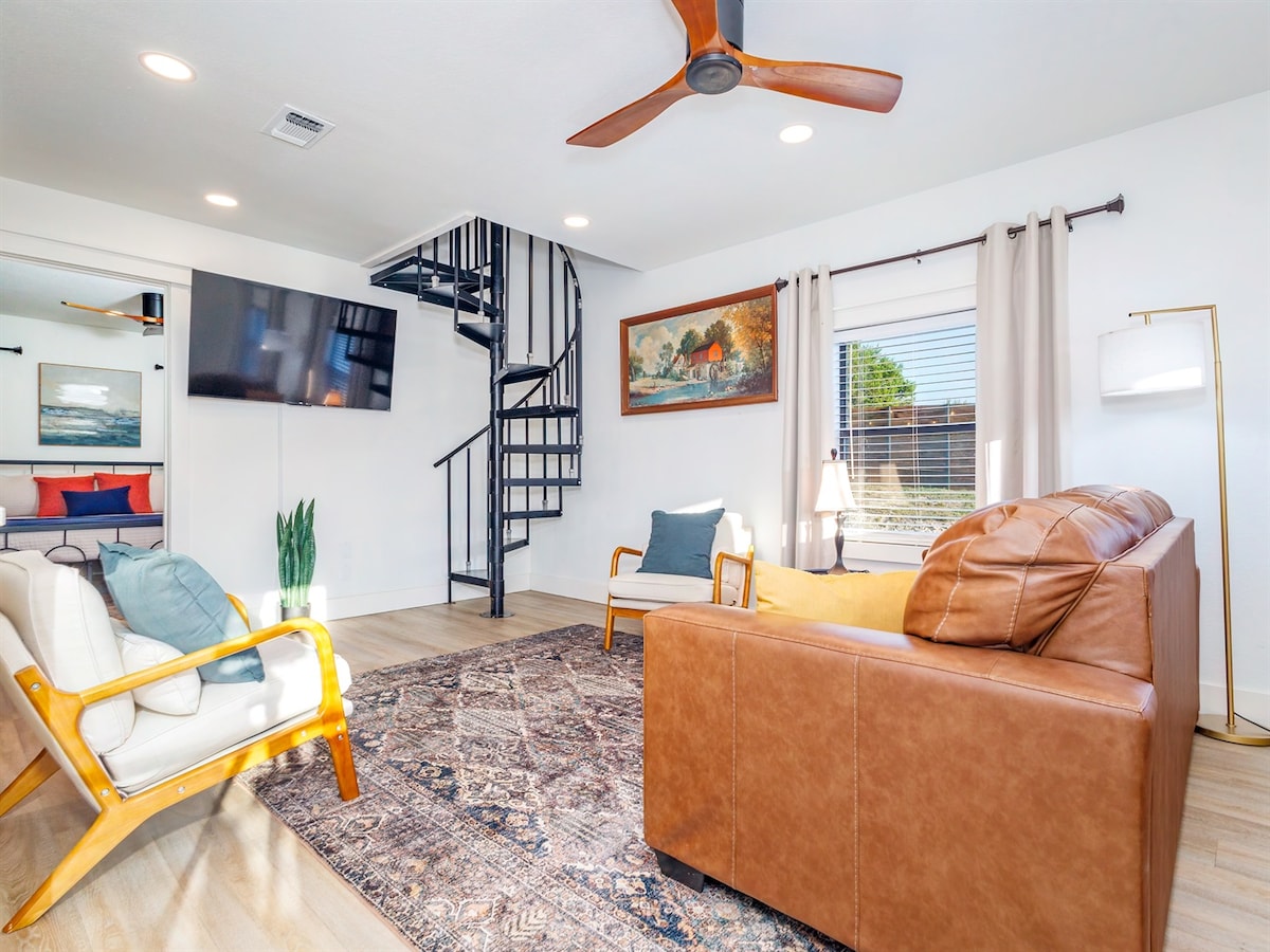 🏡Private guesthouse just 1 mile from town—perfect for a peaceful getaway! 🎀 Decorated for the holidays 🛏️ 2 bedrooms (downstairs + loft), sleeps 6 🚿 Walk-in shower ✨ Hot tub under the stars 🍽️ Full kitchen & dining area 📺 2 Smart TVs 🌀 Spiral stairs to loft ✨ String lights & BBQ grill 🐾 Pet friendly 🌾 Located down a private ½-mile dirt road 📍5 min to Goldthwaite, 20 mins to San Saba, 30 mins to Regency Bridge