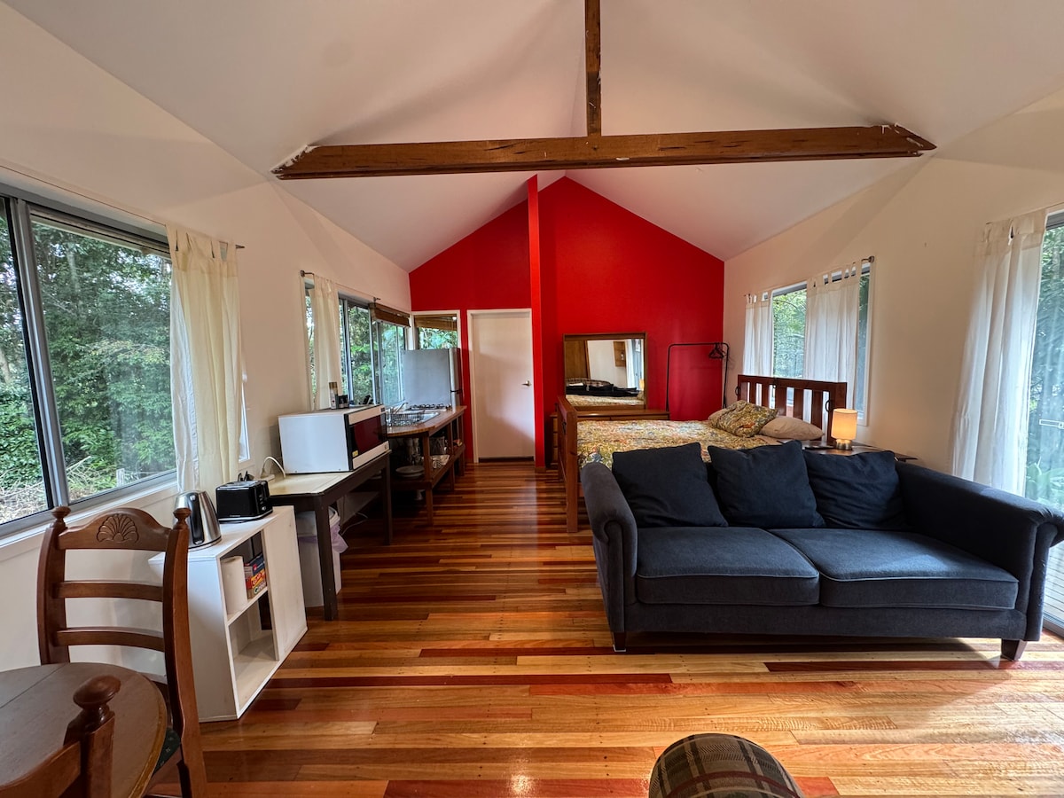 Inspired by tiny homes all over the world, this 30m2 space has been architecturally designed to make you feel cosy and comfy at anytime of year. Enjoy a 30sec walk to the beach, local coffee or food, or snuggle up in front of the fireplace in those colder months. Suitable for a couple (sorry no kids) It’s a loft, so the bedroom area has ladder like steps and a low roof. But it all adds to the charm. Enjoy sitting in the tree tops and watching the world go by in our little beachside town.