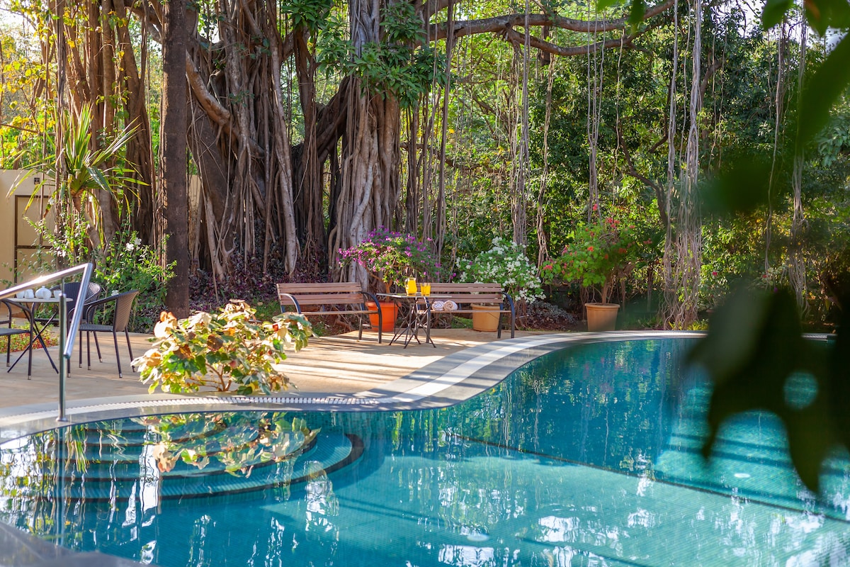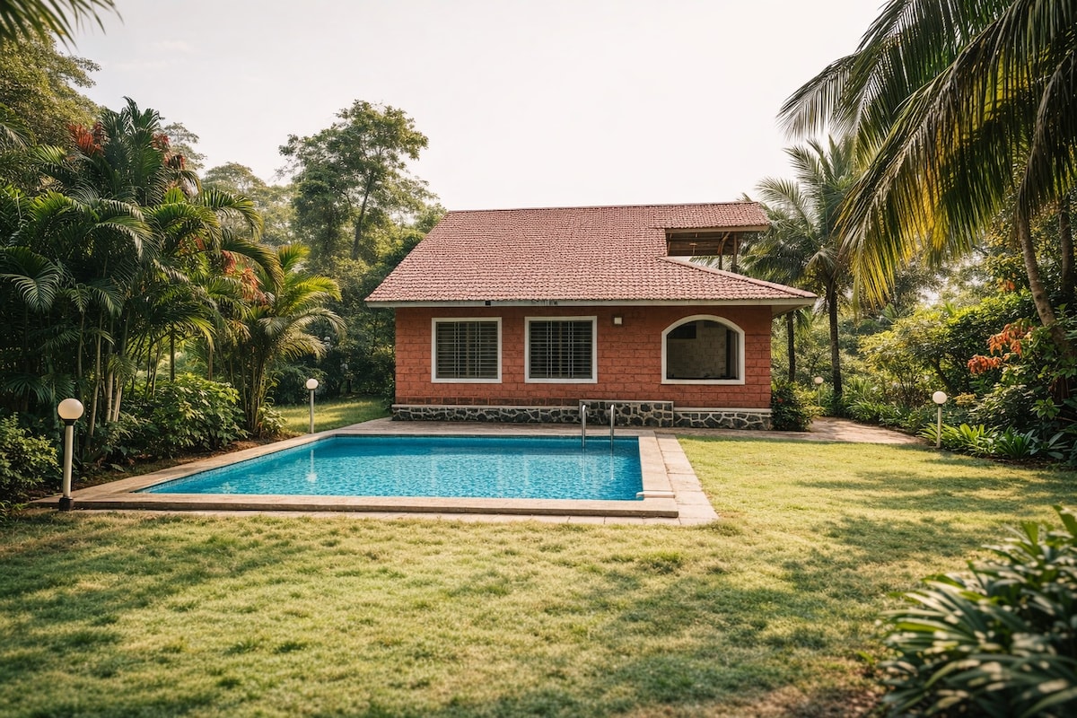 Escape the city & rejuvenate in nature with family at this half acre, peaceful, beautifully restored farmhouse - complete with your very own private stream! The property has multiple levels of lawn, and is abundant with trees and plants. The house has been restored in a Goan/Portuguese style with Burmese teak wood doors and windows, Spanish tiles and original teak & rosewood furniture. Relax on either the front or back balconies, and enjoy extensive garden lighting, and a bonfire at night!