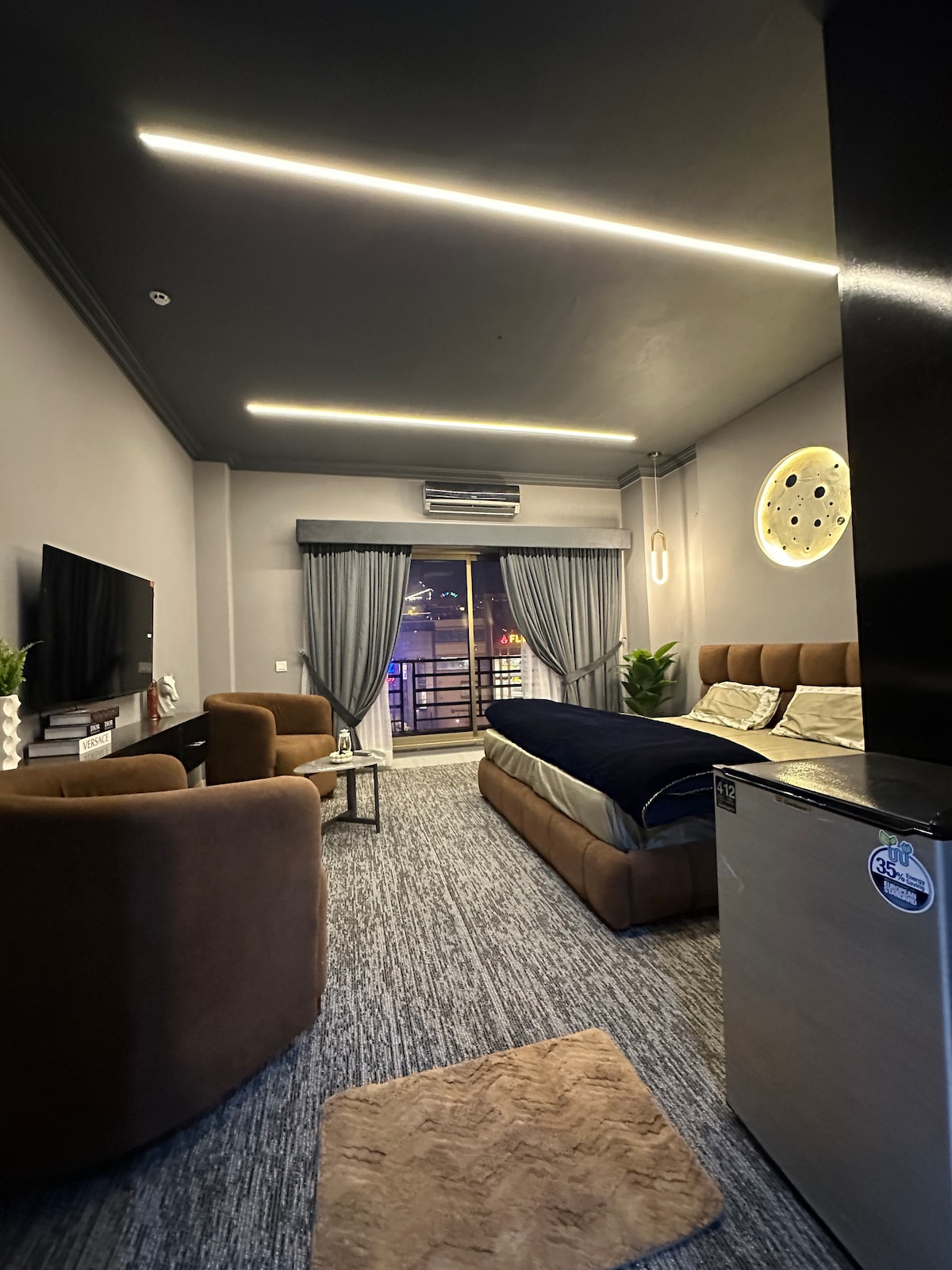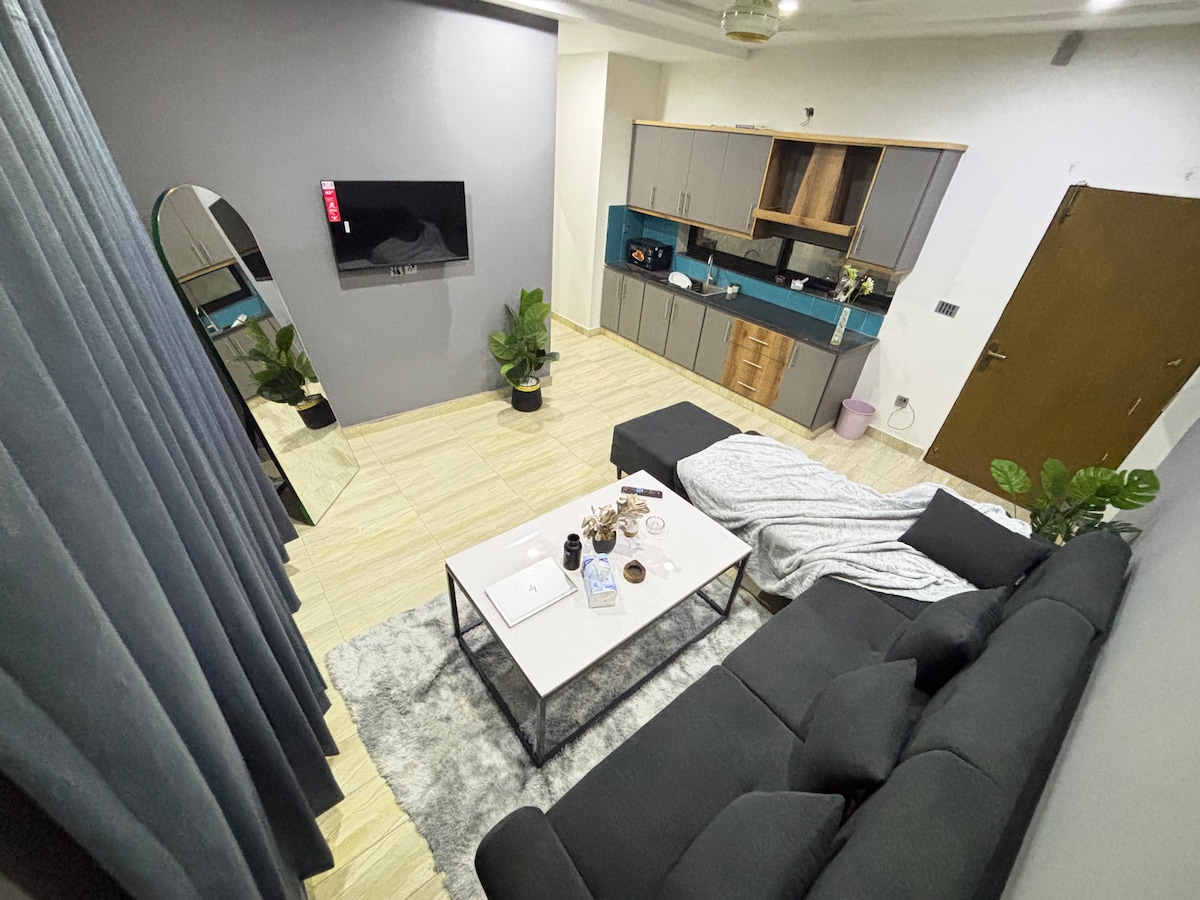 Escape to our serene bedroom oasis, perfectly suited for couples and small families seeking a relaxing getaway .Enjoy a comfortable night's sleep in our cozy bedroom . The apartment features a comfortable bed, a well-equipped kitchenette, and a fully smart tv, air conditioner, 24/7 internet, electric heating rod for hot water. Located in a prime location, you'll have easy access to nearby attractions such as imtiaz mall, Buch international hospital, cinema and restaurants .