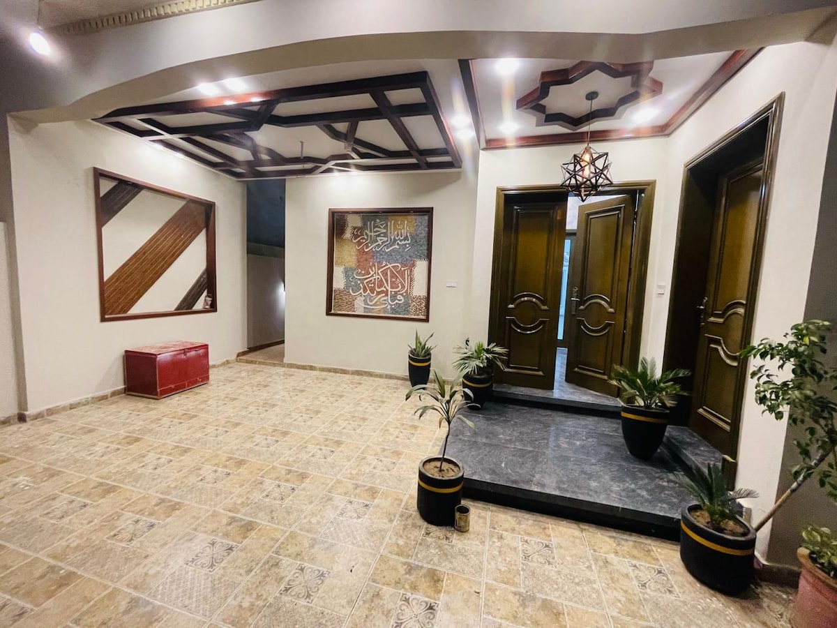 Forget your worries in this spacious and serene space. 1. Central location 5minutes from Multan cantt 3 minutes from Multan Industrial estate. 2. Family friendly only no couples and stags allowed. 3. Free parking safe and secure 4. Within a gated society Multan Golf City 5. Only one room can be booked too. 6. small room 3k per day big room 5k per day 7. Free wifi 8. Extra matresses available 9. o34o2734346