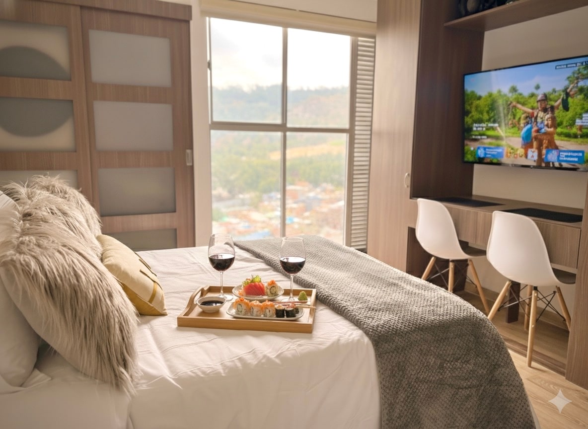 Experimenta la elegancia en la exclusiva zona de Usaquén, Bogotá. Este moderno estudio en el piso 14 ofrece una vista impresionante de la montaña. Ideal para viajes de negocios o parejas, cuenta con WiFi, cocina, microondas y armario espacioso. El edificio ofrece seguridad 24/7, gimnasio, coworking, una azotea y hermosas vistas. A poca distancia de North Point mall, restaurantes, bancos y cines. Nota: Tener en cuenta que hay construcción cerca durante el horario comercial.