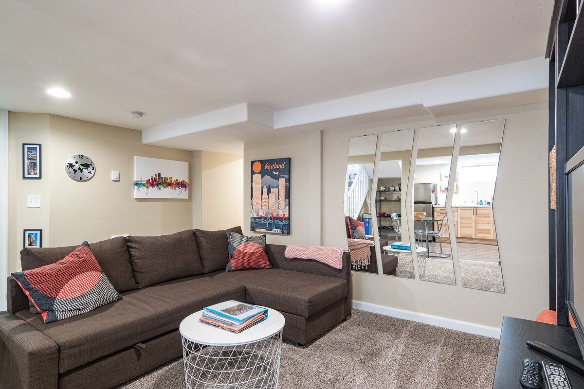 Find economical luxury for long or short stays in our bright, beautifully furnished 1-bedroom apartment in the Irvington Historic District, close to the NE Broadway shopping and dining area, and well served by TriMet transit. You'll like the new construction, modern appliances, super comfy beds, two TVs and high speed WIFI. The unit is a separate sound insulated space giving you total privacy, with no air circulation to the main house and a private entrance directly from the street.