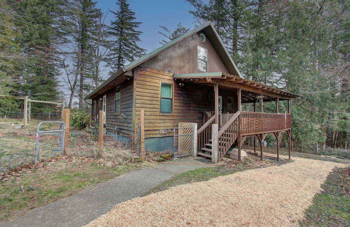 An experience of a lifetime awaits on our organic farm just 30 minutes from Portland and moments from fabulous hiking and sightseeing. Luxuriate and relax in our magical cabin in the woods! Listen to a chorus of birds while you cook in the outdoor kitchen. Take a hot shower surrounded by 180 foot trees, and complete your amazing experience by adding on a private farm tour where you will learn about our sustainable farming practices while visiting our goats, sheep, cattle and more!