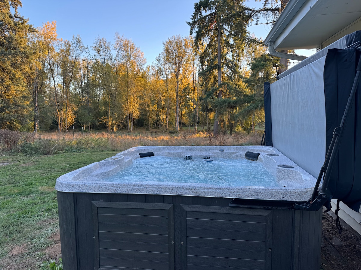 Escape to this dreamy 2BR forest retreat on the Washougal River, just 22 min from PDX. Private 2BR lower-level guest suite attached to our family home (we live upstairs). Relax by the fire pit, soak in the hot tub, lounge by the river, & enjoy the 1-acre yard with river access. Catch salmon or steelhead, float with kayaks & tubes, swing under the trees, dine on the patio, or unwind in the soundproofed suite with full kitchen, king + queen beds, & private entrances. Peaceful riverfront setting.