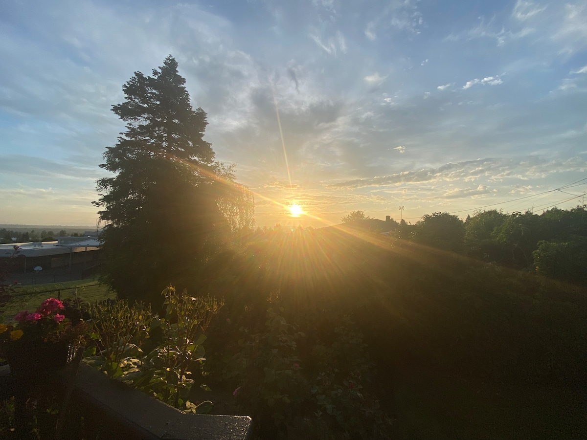 Enjoy relaxing NO CHORES TO DO beautiful view from private balcony and bedroom! Comfy King size bed, walk- in closet, writing desk and 2 chairs. TV and WiFi . Only 17 minutes drive from the Airport and super close to many waterfalls,hiking trails and 4 minutes to Edgefield, 5 miles from Blue lake, a few minutes from Multnomah Falls, Bridal Veil Falls, and so many others Gorge falls and hiking trails, Columbia river adventures. it is located in safe neighborhood. Ask about a romantic package!