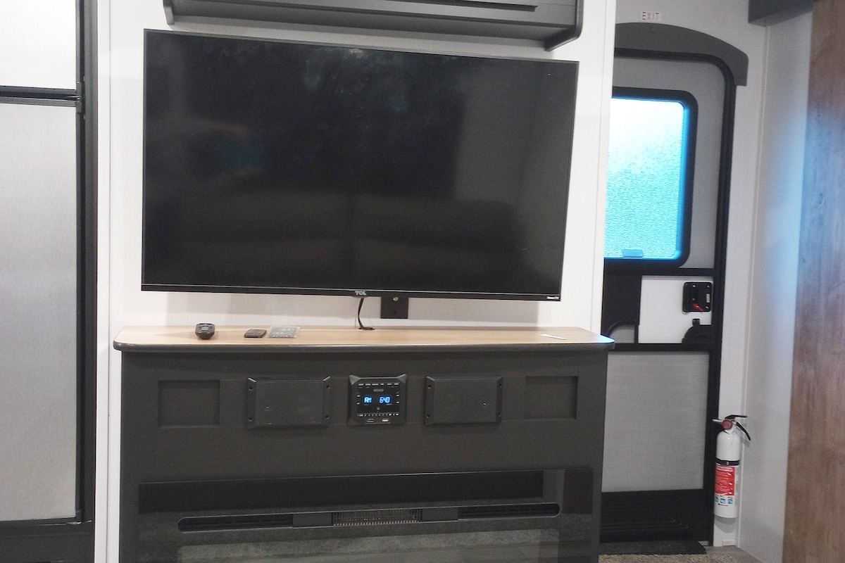 36’ 2018 luxury trailer , kingsize bed, dresser , closet , pull out couch bed , dual reclining chairs , two fridges, two freezers , island kitchen sink ,and countertop , kitchen table ,two bench seats, folds down to a single bed,electric fireplace , 50” tv,20 tv channels over the air or dvd movies only , DVD player ,stereo, microwave, propane stove , propane heat, ac,bathroom,shower is on the smaller side ,may use shower in host home upon request and availability .