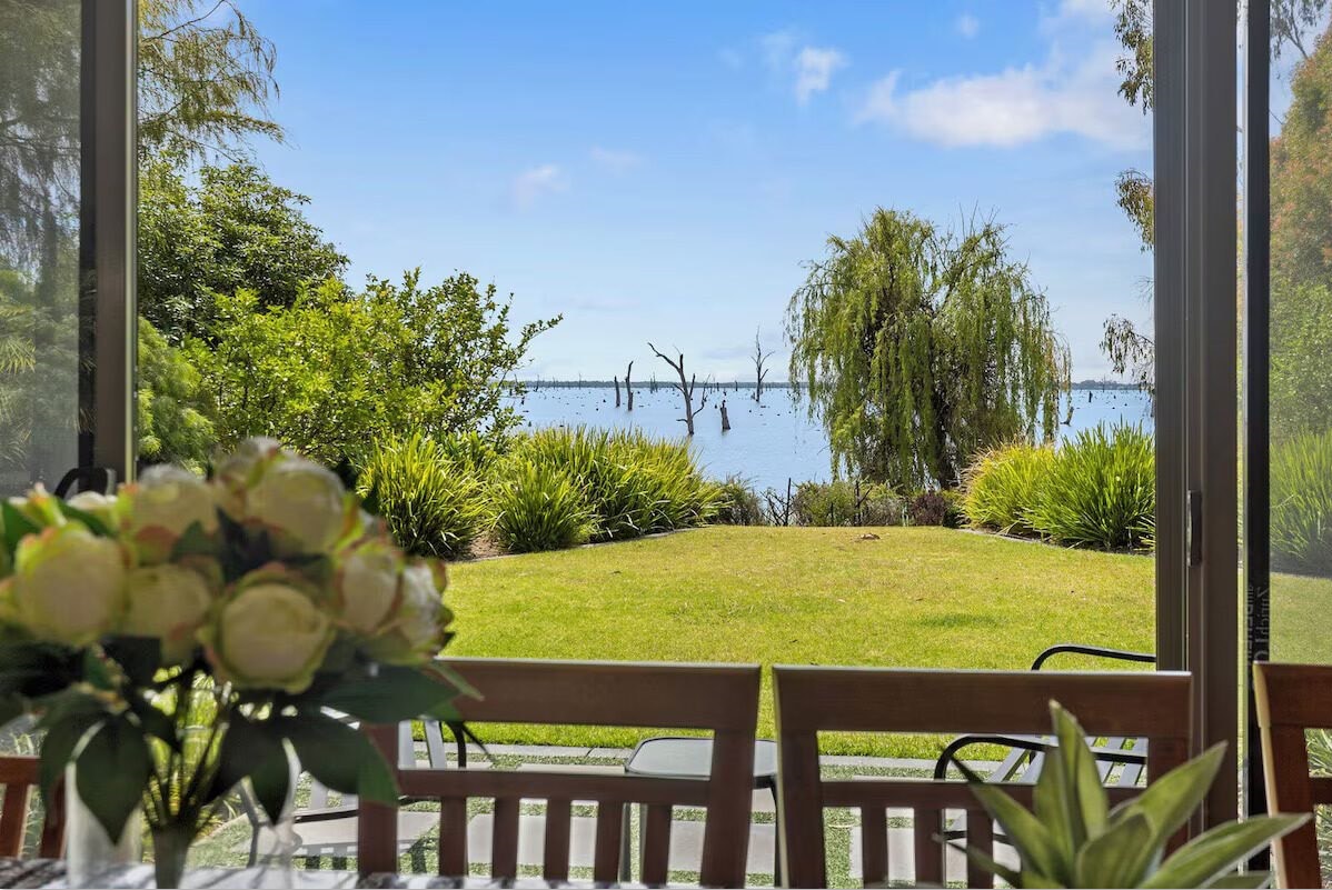 Right on the water … you can’t beat this serene location right on Lake Mulwala. Only 5kms into town and 4kms to Black Bull/Silverwoods golf course and a nice quiet location on the water with your own private jetty. Head into the clubs and book one of their courtesy buses that pick you up and drop you off so no need to drive! Enjoy breakfast lunch and dinner outside with magnificent views across the lake!!
