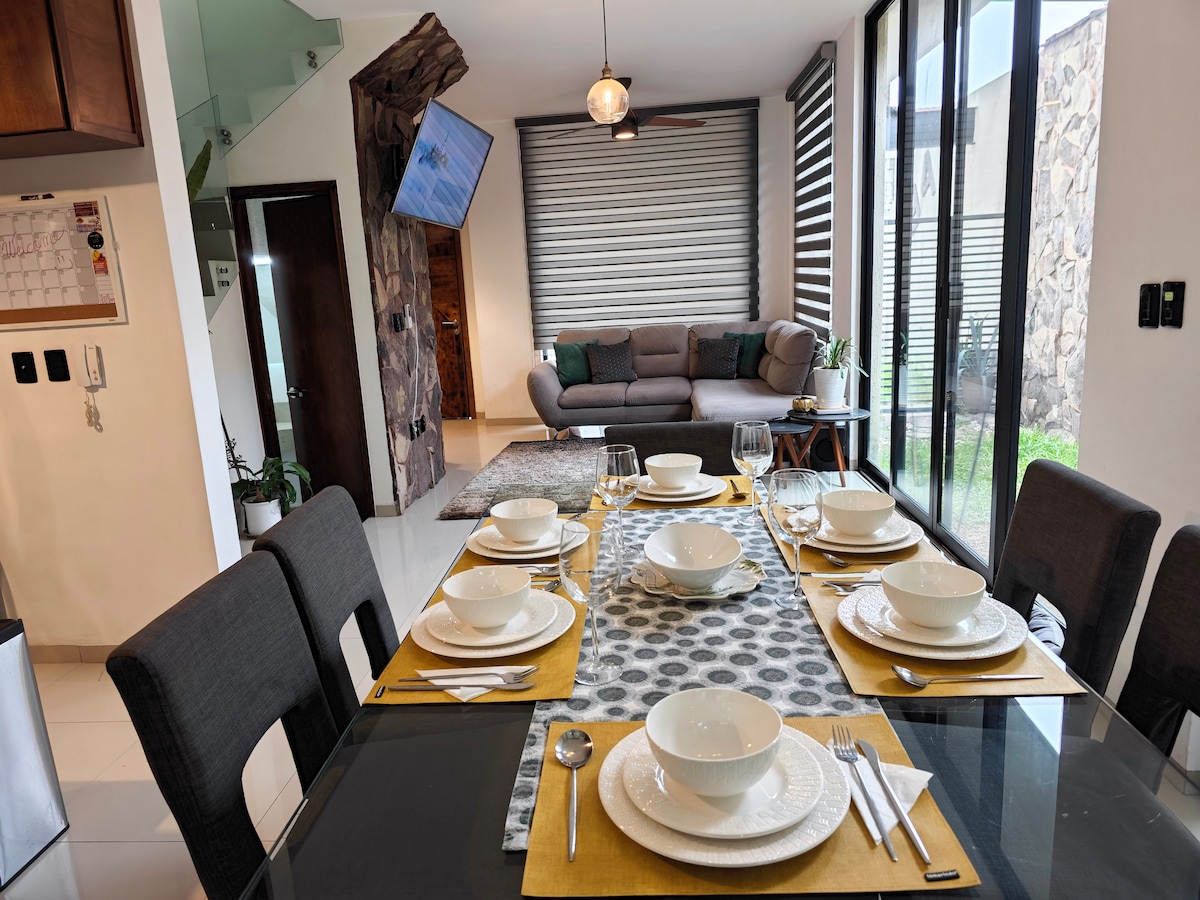 Cómoda casa totalmente equipada, en fraccionamiento privado con seguridad 24/7, rodeado de áreas verdes, para disfrutar en familia o viaje de trabajo. A 5 min de plazas comerciales: Mulza, Outlets y Altacia. Cerca del aeropuerto, Poliforum, Feria de León, Puerto Interior, Hospital de alta especialidad, Universidades y de más sitios de interés, como la ciudad de Guanajuato. - Cada con baño completo - Puede salir a caminar o correr en ambiente seguro. - Colchones memory foam - Canales digitales